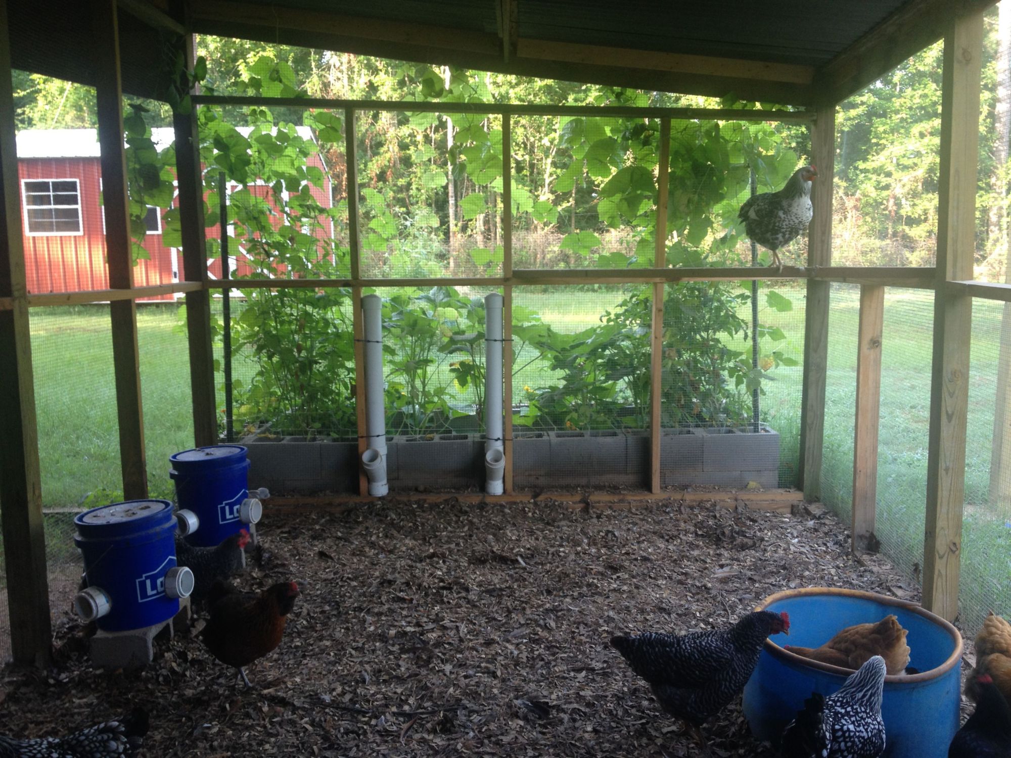 2nd feeder (not shown): a 3 foot section of vinyl rain gutter, used for group feedings, fermented feed and table scraps. All 15 birds can eat at once.