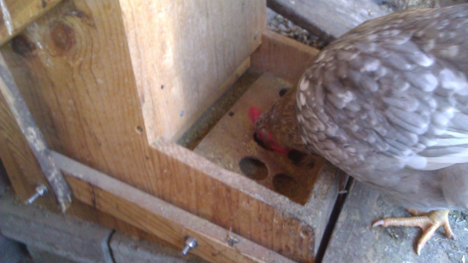 Feeder #1: Homemade treadle feeder, keeps rodent population down. Insert (board with holes) eliminates birds billing the feed out to get the choice bits. Only downside is our smallest banty has a hard time using it unless another bird is also on the treadle (she steps on the edge of the feeder instead of the treadle).