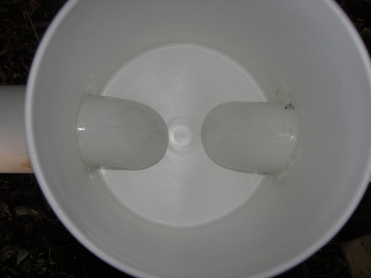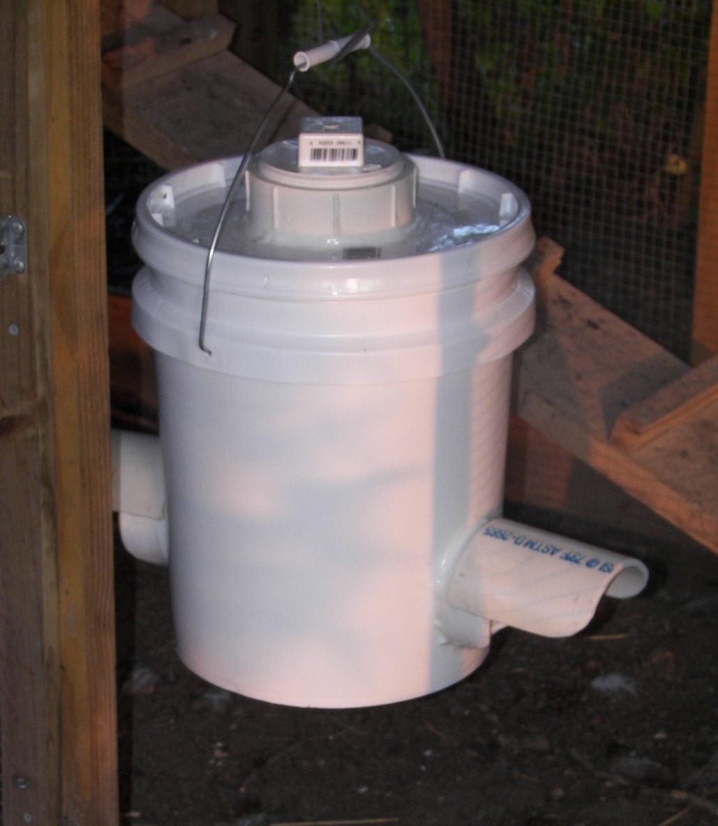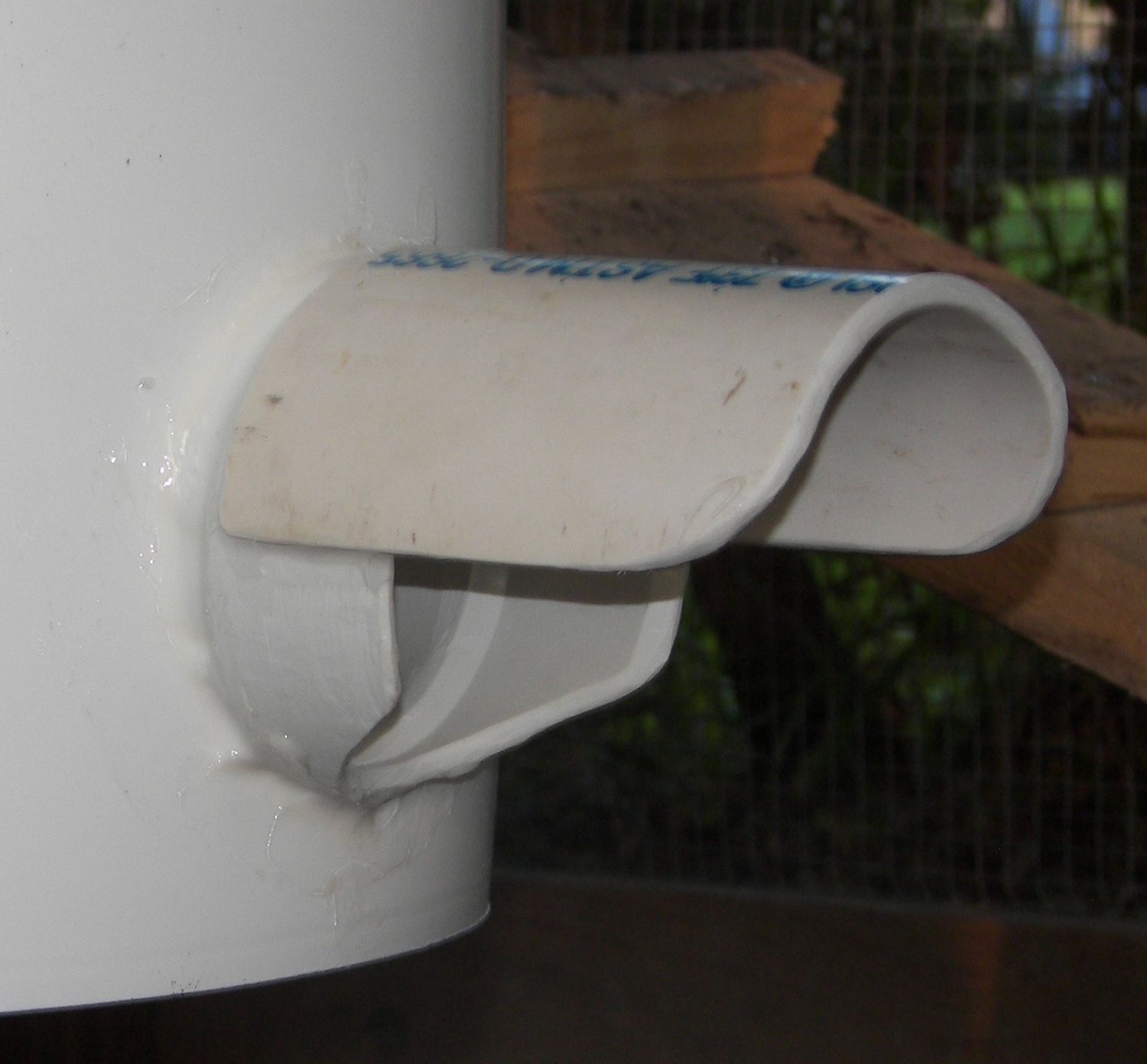 It's a 2' length of 4" diameter schedule 35 PVC (drainpipe) with a cap on the top, a downspout tie-in fitting on the bottom with a 4" deck post cap attached to the fitting. I drilled holes in the back, put zip ties through them and hook the feeder to the wire of the coop with s-shaped carabiners.
