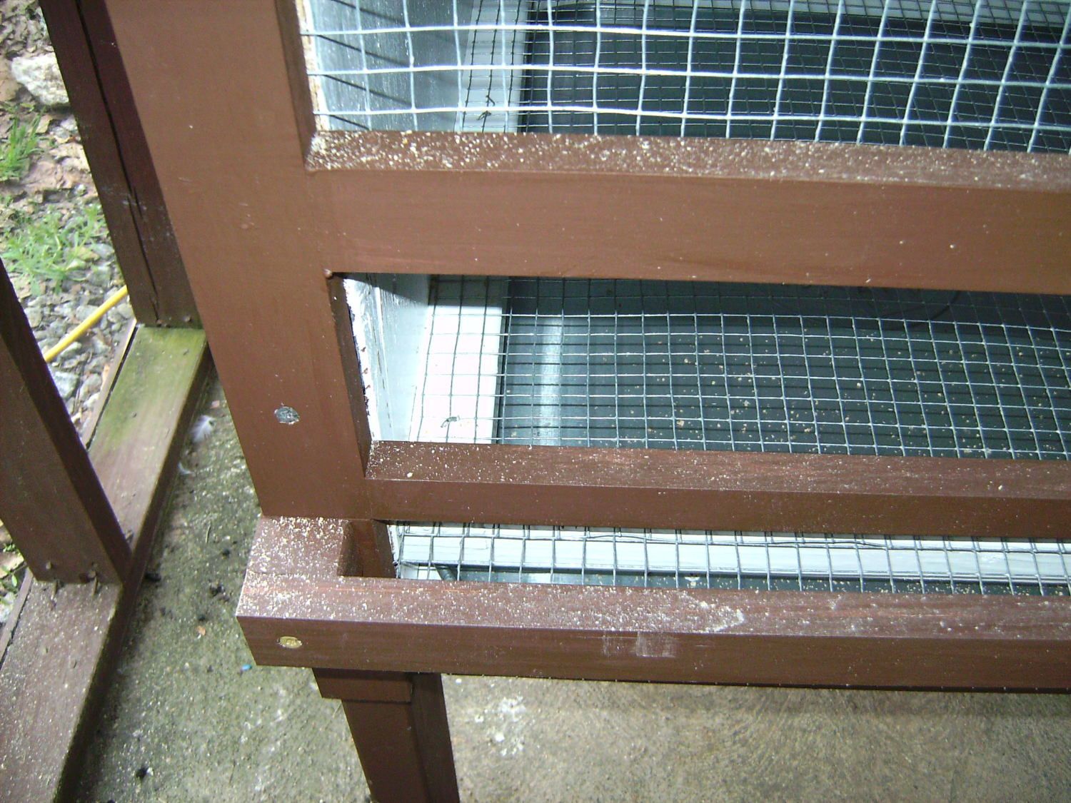 The poop trays (not in the photos) ride on rails under the pen floor. The poop trays are oil pans that catch oil leaks on old British cars