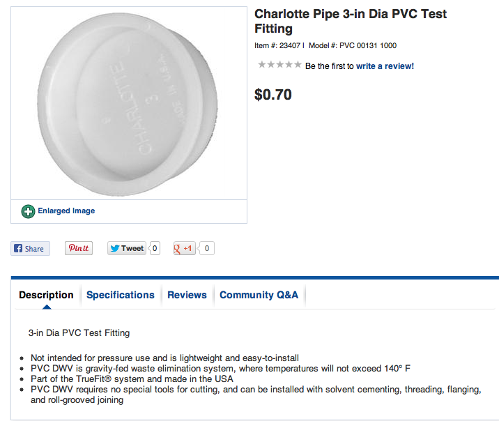 Thanks for all the info! I found the galvanized oil pans (3x2) at a Reilly's Auto here=] For your condo, how many quails per level do you have?Yes, the stands for the feeders are just painted pine. I drew them up in my CAD program and then machined them out on my CNC router. I just hot glued them to the PVC pipe. The caps are called test fittings and are made by Charlotte. I'll attach a photo from Lowe's website. You could just cut circles from wood and caulk them in place. The slope of my floor drops 2 inches in 24 inches of run. I haven't had a cracked egg yet. Sometimes an egg will get caught in a low spot on the wire and I have to reach in. I am currently hanging a 1 gallon plastic poultry waterer in each pen. I am looking for a way to have spigots in each pen for automatic watering. I know someone who is using these for quail and says they work well. http://www.ebay.com/itm/Chicken-Wat...t=LH_DefaultDomain_0&var=&hash=item1c27f60bca I don't use milk jugs for dusting, but like the idea. I currently just use a small tupperware bin which they empty in a single afternoon. Hope that helps and I'm learning something new everyday.![]()