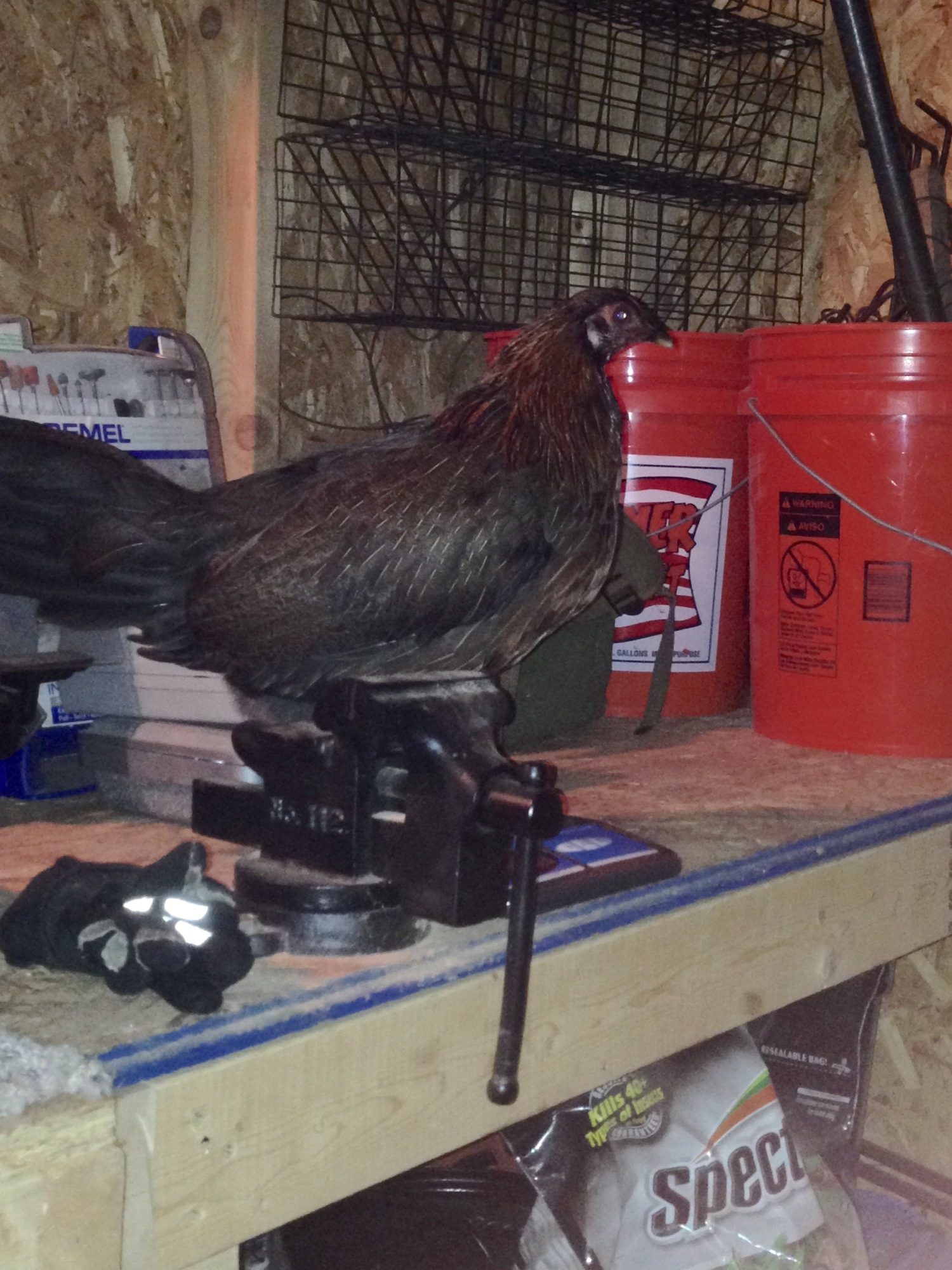 heres a dark pullet. tried letting her run the yard for a few days but she just goes back to the pens to cause trouble. Back in the pen she went.
