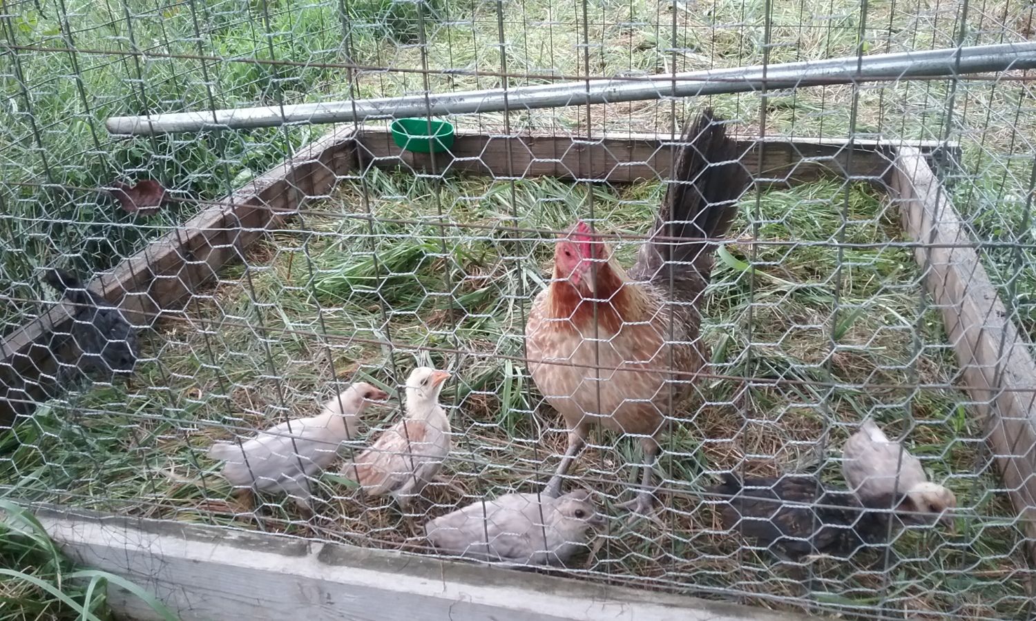 Here's a pic I took 2 days ago. Day old chick already out of the pen and was wandering off. I watched the hen for a bit. She was losing her mind since I have so many pullets and stags running loose. I couldn't leave her like that and she's too aggressive to let her run with the chicks. I put her in a bigger pen with hardware cloth with her chicks. I have let a few go like that but I don't think it's fair.