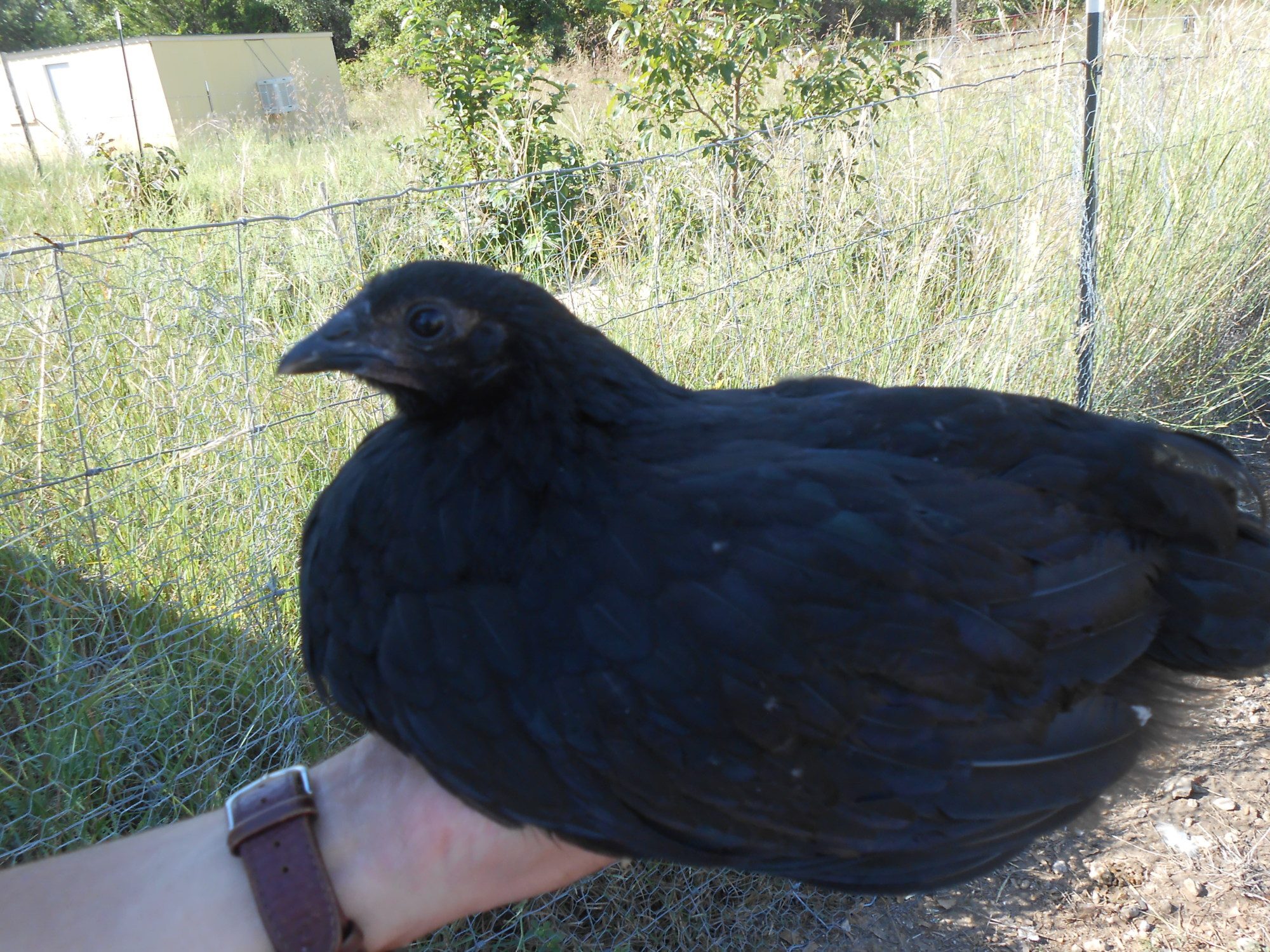 She's about 14 months old. We got her and two others to graft onto a broody hen, since her egg was rotten. The others died, alas, but she survived and is going strong. Her mother took care of her until just recently. Now she's on her own. She's really sweet.And talk about spoiled!