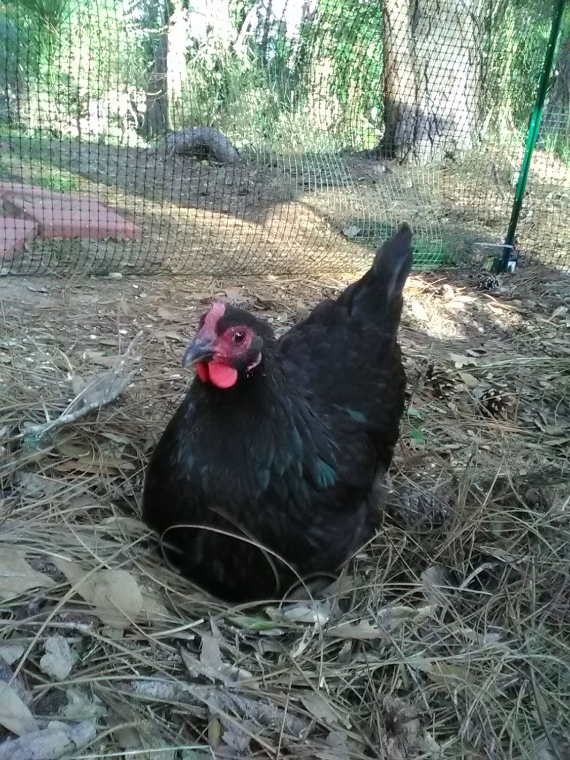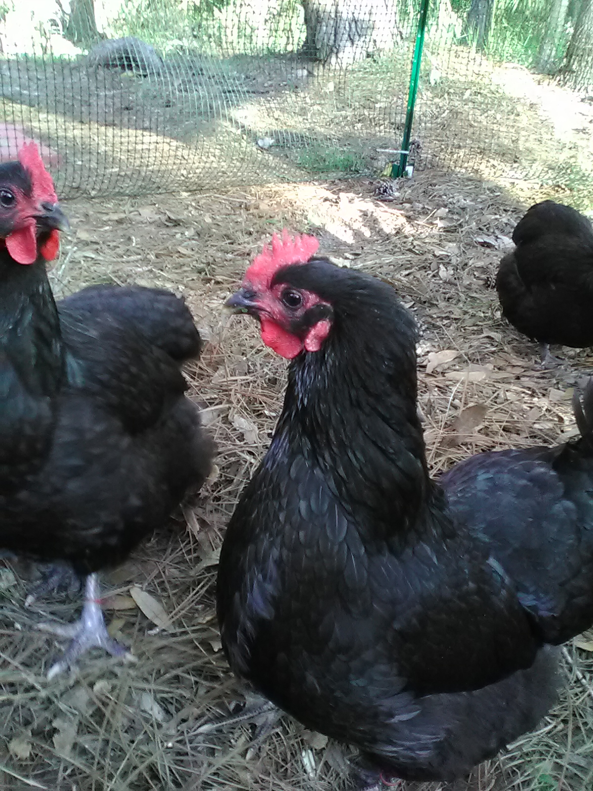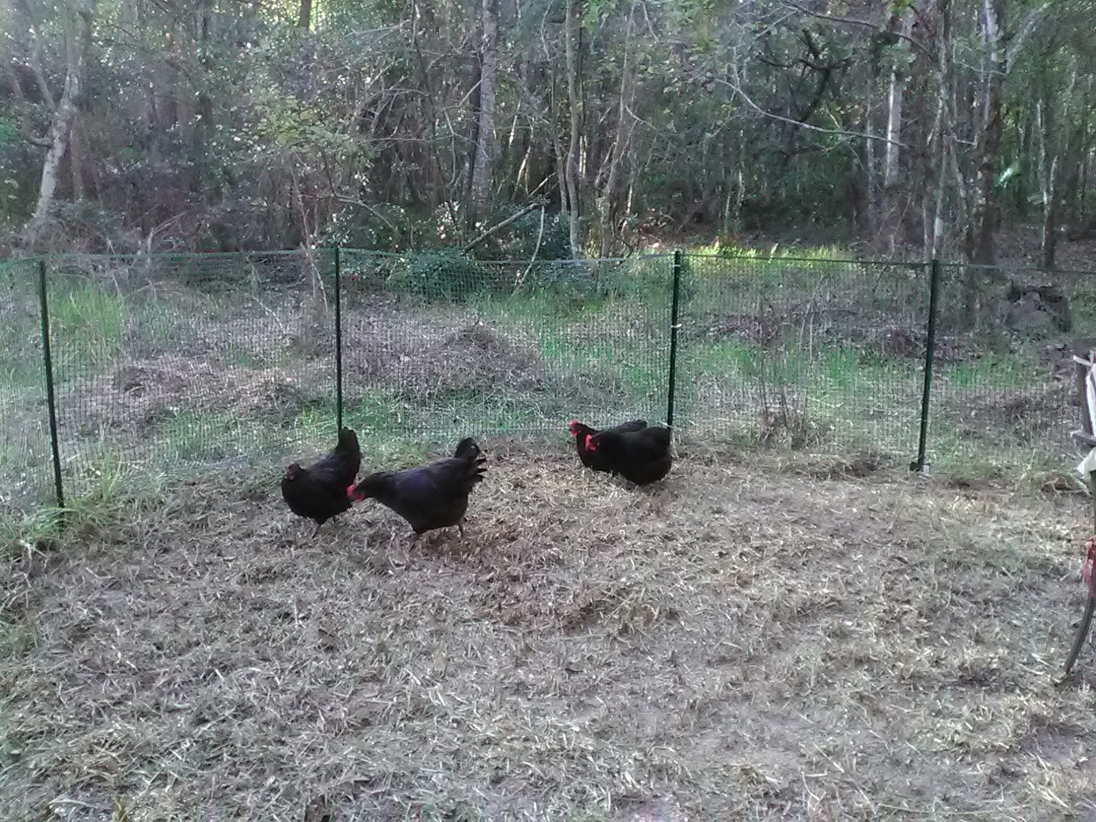 Here are my pretty ladies enjoying their new 75 square foot run...These little cuties are 6 months old and are doing wonderful....We've been blessed with an egg from each everyday...My papillon takes his job as their protector very serious...except when he's chewing his bone ;-)