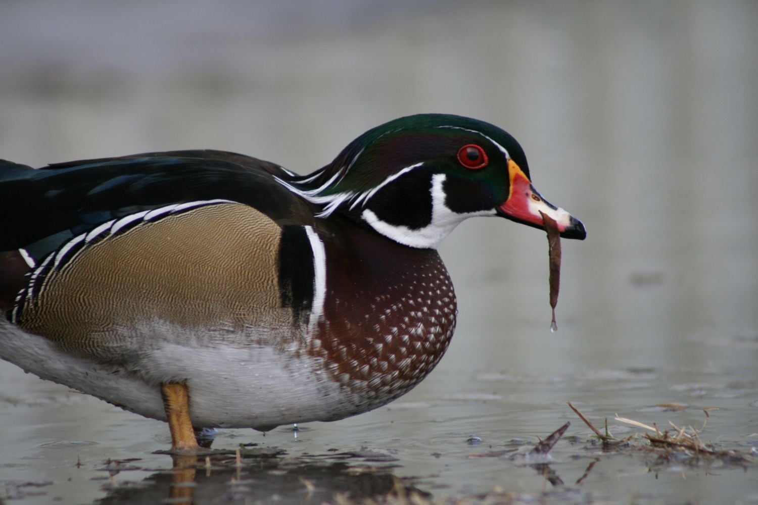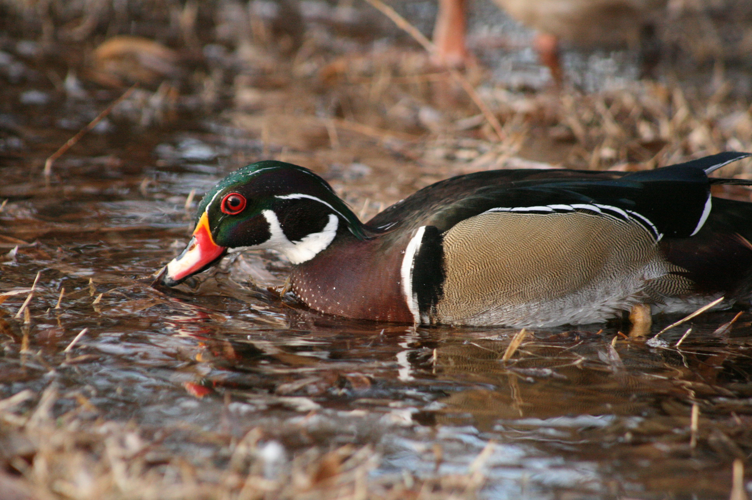 Snuggles, our Wood Duck drake. Snuggles isn't really into protecting the flock, he's only interested in showing off to our Khaki Campbell hen, Mildred.