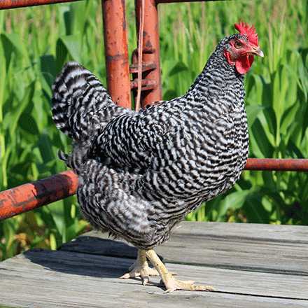 Barred Rock I have seen barred pumpkin birds... I could of sworn some one was working on it as a project but I could not find an image of those game cocks. I hope this helps.