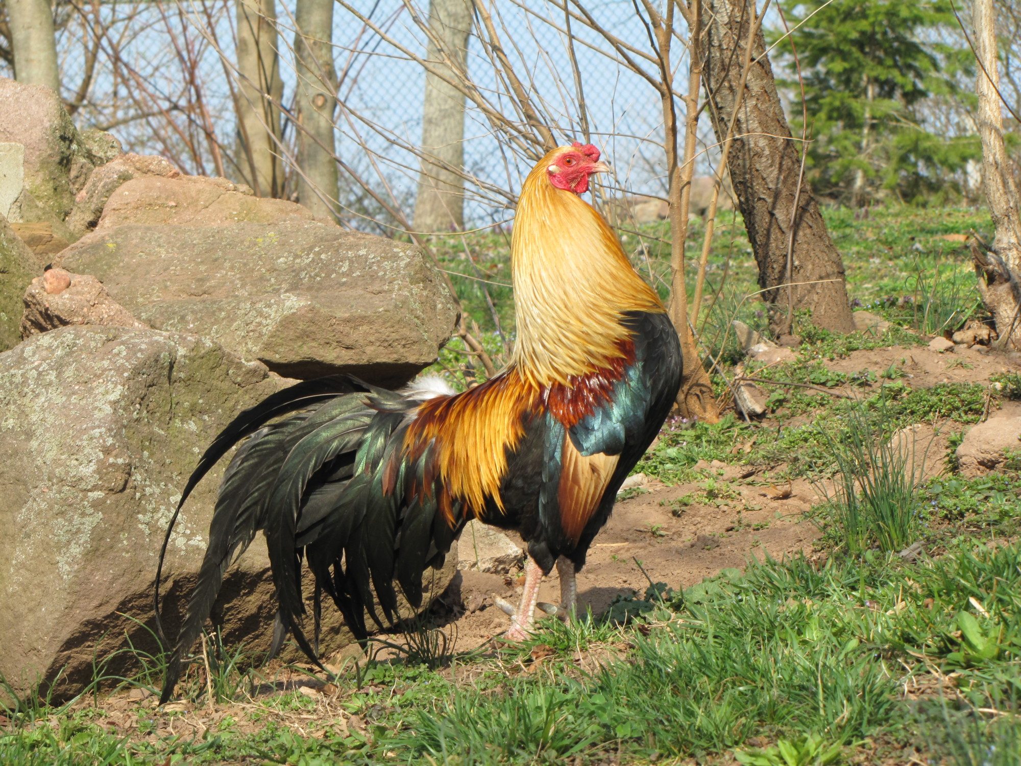A few of the cock's offspring from last year, birds this year are too young/free ranged for me to start taking photos of them. Never gotten spangled lemon hackled birds if that is what you mean by light red spangles, but some do come with semi-pumpkin lookinh coloration due to the Shelton Roundhead blood though not easily noticable in the photo below his saddle is a definite orange, some of his breast feathers as well I believe though most are white with black spotting on him. Most come dark red colorations with spangles like the Avatar and the darker bird below which is how I tend to prefer them but color really isn't a big deal with these guys to me.