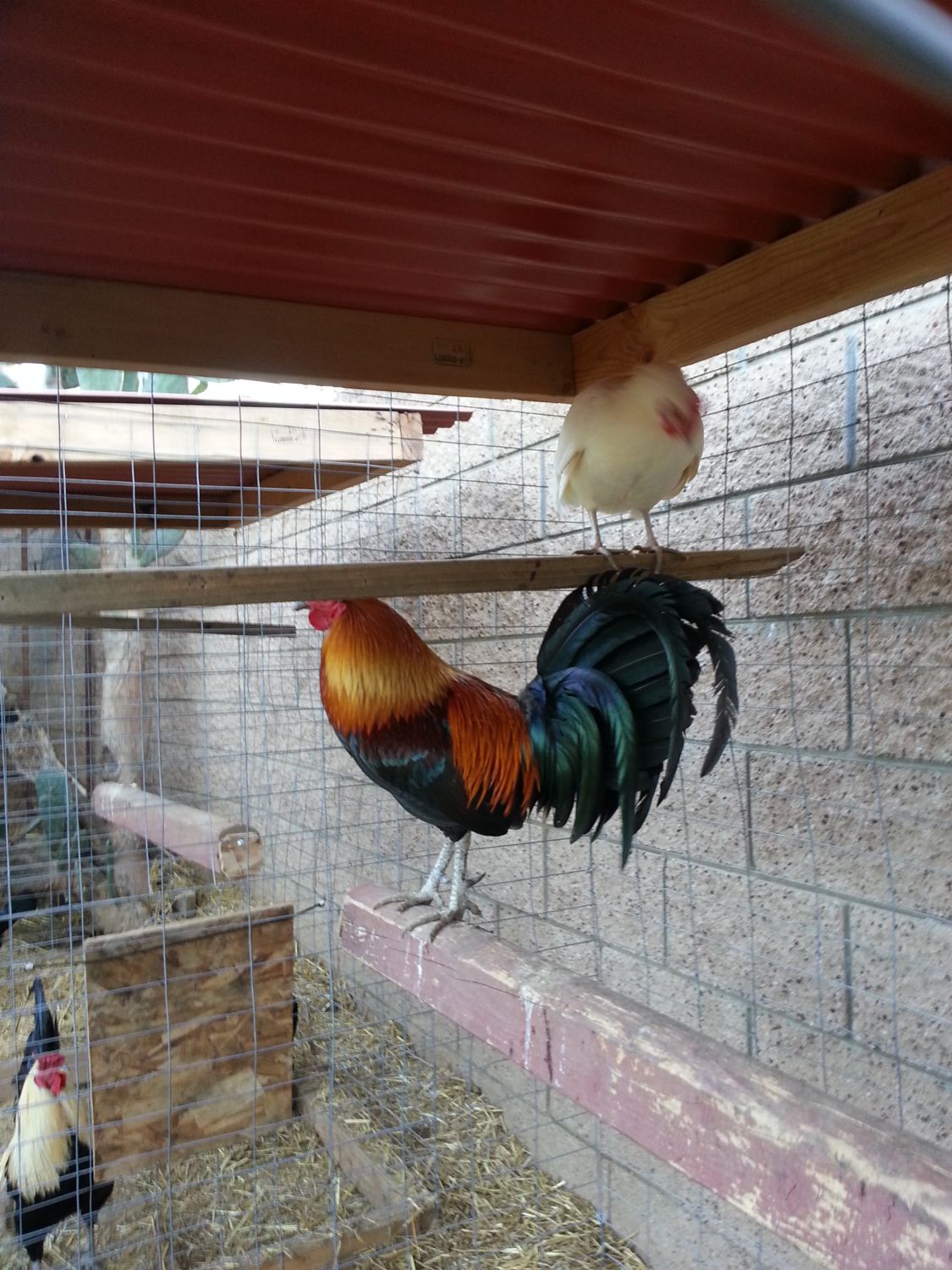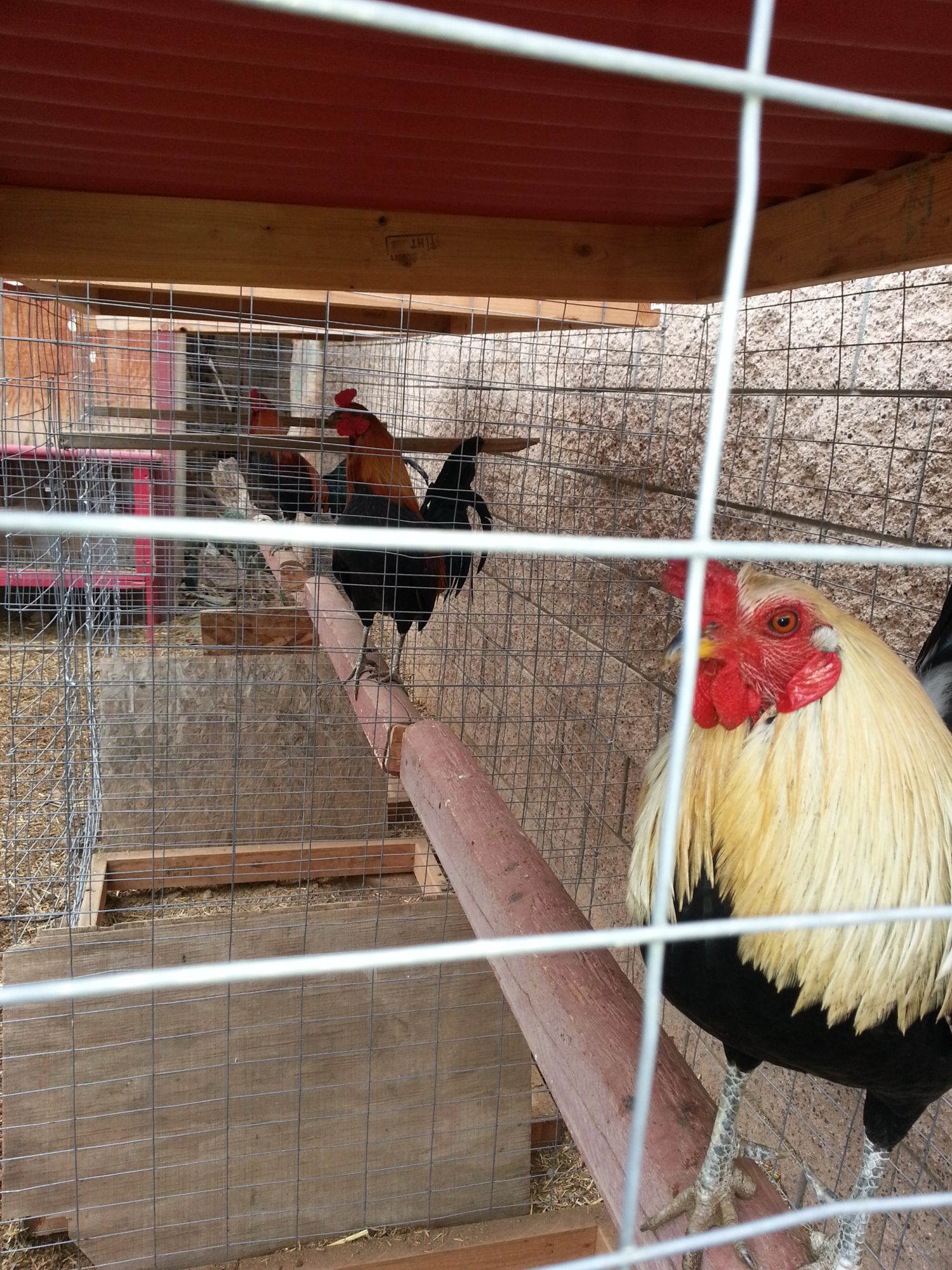 They are 4'x3' and 5' tall... I didnt use chicken wire.. I use Cattle fencing. I bought two 50ft rolls, 4ft tall and 3 ft tall which I used for the sides. I didnt use any vertical posts, just wired the sides to eachother, which makes it strong enough to support a cap and roof. I built a base and cap out of 2'x4's and just stapled the fencing to them. I used red corragated roof screwed to the cap for shade... but I also bought cloth painters tarp (4'x15') to cover the top and sides, because the sun is brutal. The cloth is removable... I have two perches, one you see, the other is up high where the sleep at night. I made the gated opening out of cattle fencing too.