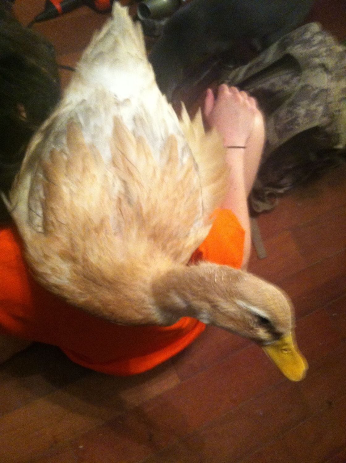 Missy is all about perching today. I think she decided that she is a Muscovy. After scaling my husband earlier, she settled on my daughter's shoulder and didn't come off until I took her off...