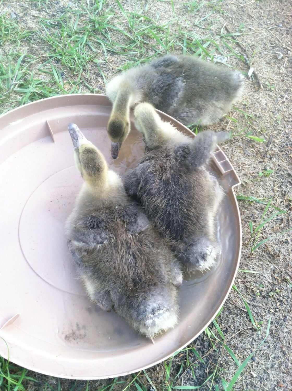 The Toulouse siblings found that the wind blew over the garbage can lid... Filled with rain water, it became an instant play tub. They were just sexed on Friday - two geese and a gander.. Have to figure out names for them as well. I'm leaning towards D'Artagnan for the gander (seeing as I named his father Aramis...)
