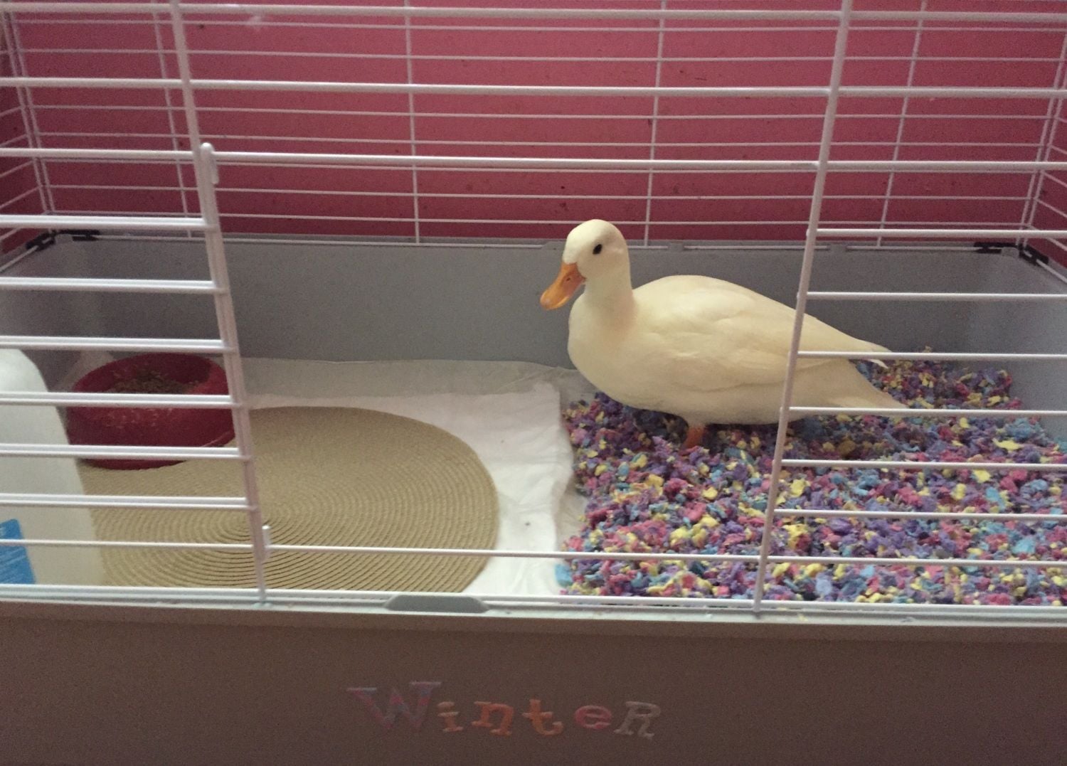 This is my house duck, Winter. And, this is her set up. It's in my room with me, my boyfriend, and our three Yorkies. My Yorkie Palmer is my baby and Winter is hers. Winter imprinted on Palmer as her momma and Palmer looks at Winter as her baby. It is the sweetest thing. Half of Winter's pen has the confetti pet bedding from either Petsmart or Petco and the other half has a puppy pad, with a placemat (like you would set at the dinner table - to absorb even more water), and her food and water bowls. I, too, cut a hole in a jug of sweet tea for her water. I only have to clean her pen every other day and it works wonderfully for us. She really doesn't make much of a mess for a little duck. It doesn't hurt either that her pen is super cute, we absolutely love it!