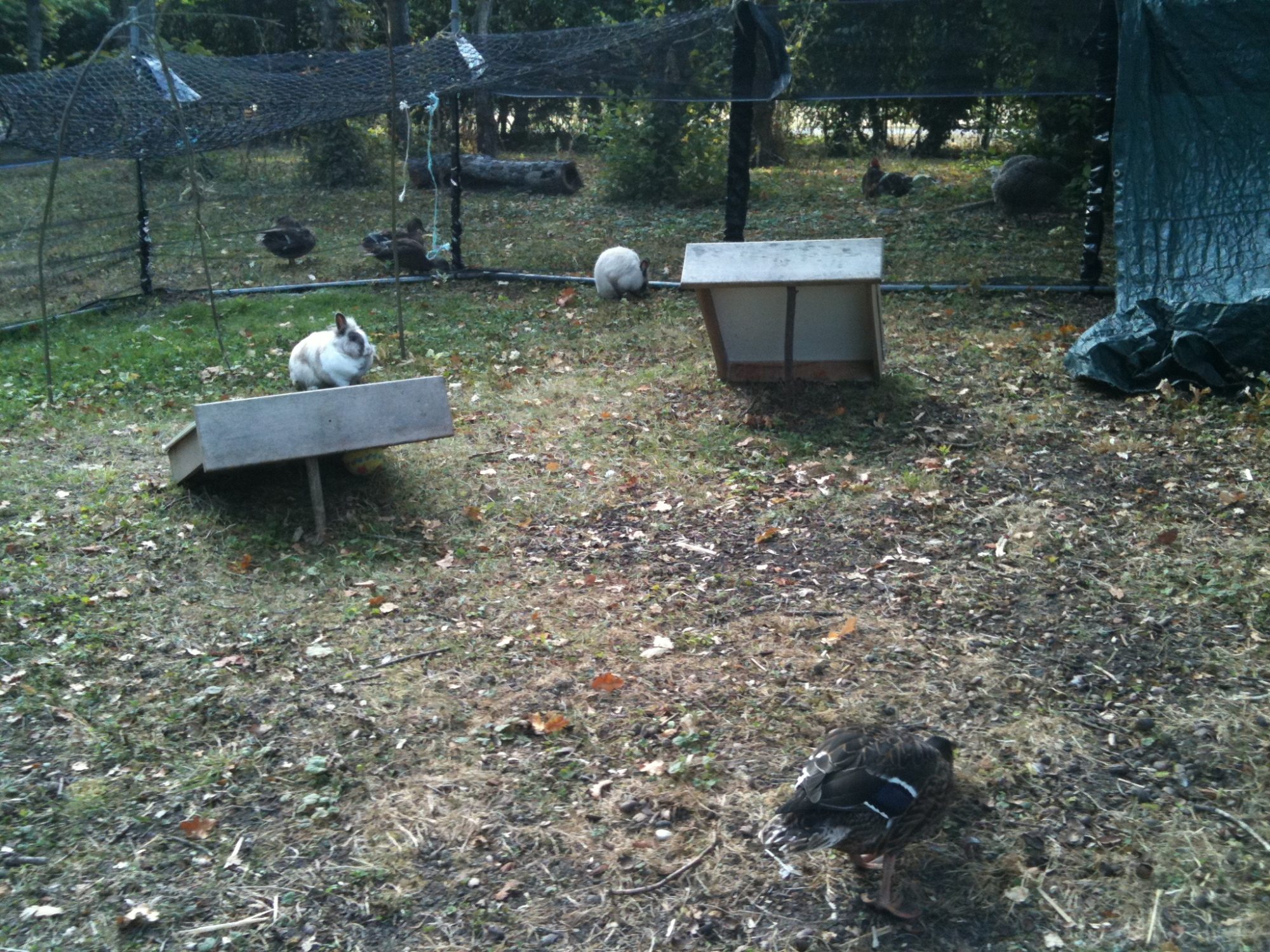 I am testing out a couple options. We also have rabbits in a large enclosure whom we visit daily, and where she is very comfortable (and whom she likes to feel she rules over). When we are there the other ducks (not 'domesticated') and our 3 hens and cockerel come to visit (on the outside). Recently it has become obvious that she prefers to be there as when it comes time to leave she is very obviously torn about following me. I tried a test yesterday and left her in the enclosure and went to work elsewhere in the garden (where sometimes she could see me, but often times not). Occasionally she would quack for me and I would answer, which seemed to suit her fine. She seemed good with being left there. She very obviously likes being with more than 1, e.g. safety in numbers.