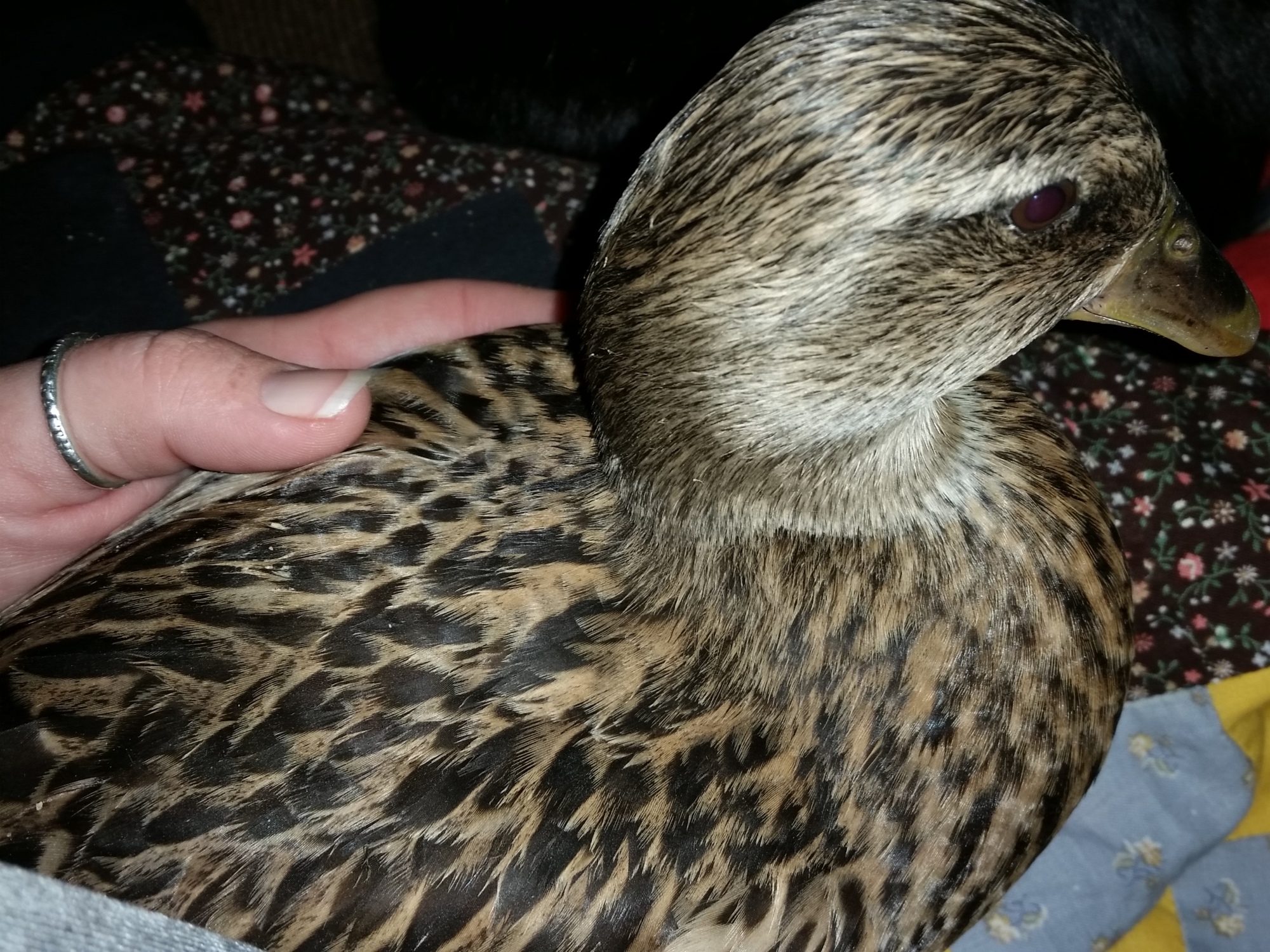 Sky : My female white mandarin Ember: My wild type male mandarin they have been inside for a while, i just moved the muscovy babies outside except of course, as whoever knows anything about my juvenile mucovies THEY ALWAYS PICK OUT EACH OTHERS FLUFF anyway so one of the boys ( Pine) Moved back in as he was stripped of all his fluff over night when they were in their coop outside, but i dont have a pic Anyway back to the pic, Sky and Ember are sooooo lovable, they love to be wrapped up in a towel and poem their little heads out and loot around then quickly curl back up inside, they do this especially when i'm transferring them room to room whenever i open the doors. Also Sky has a color mutation ( You really can't see the other side in the pic) She has a black streak of about 2 feathers parallel on her sides! She is so pretty and Ember is finally staring to get his male feathers!!
