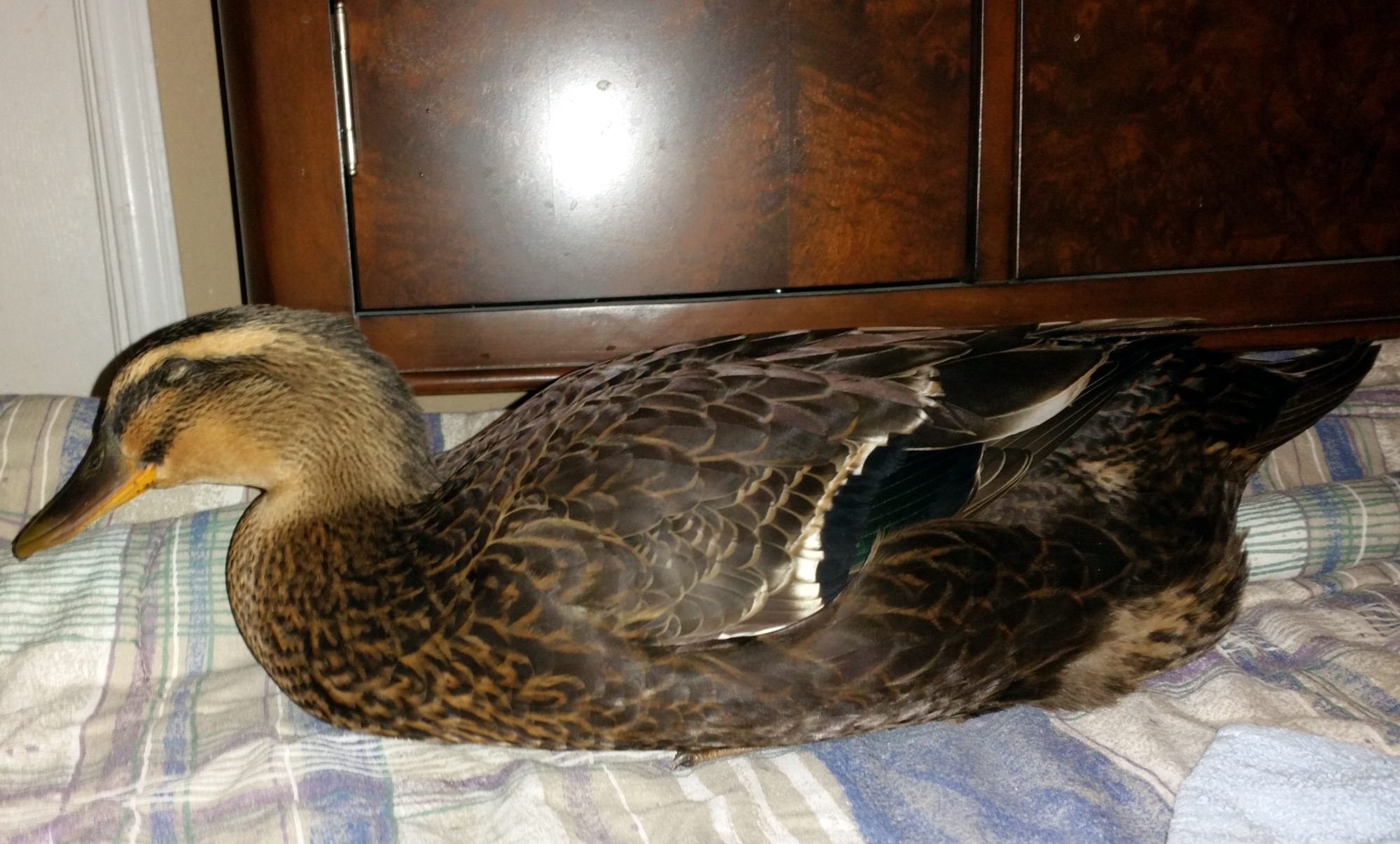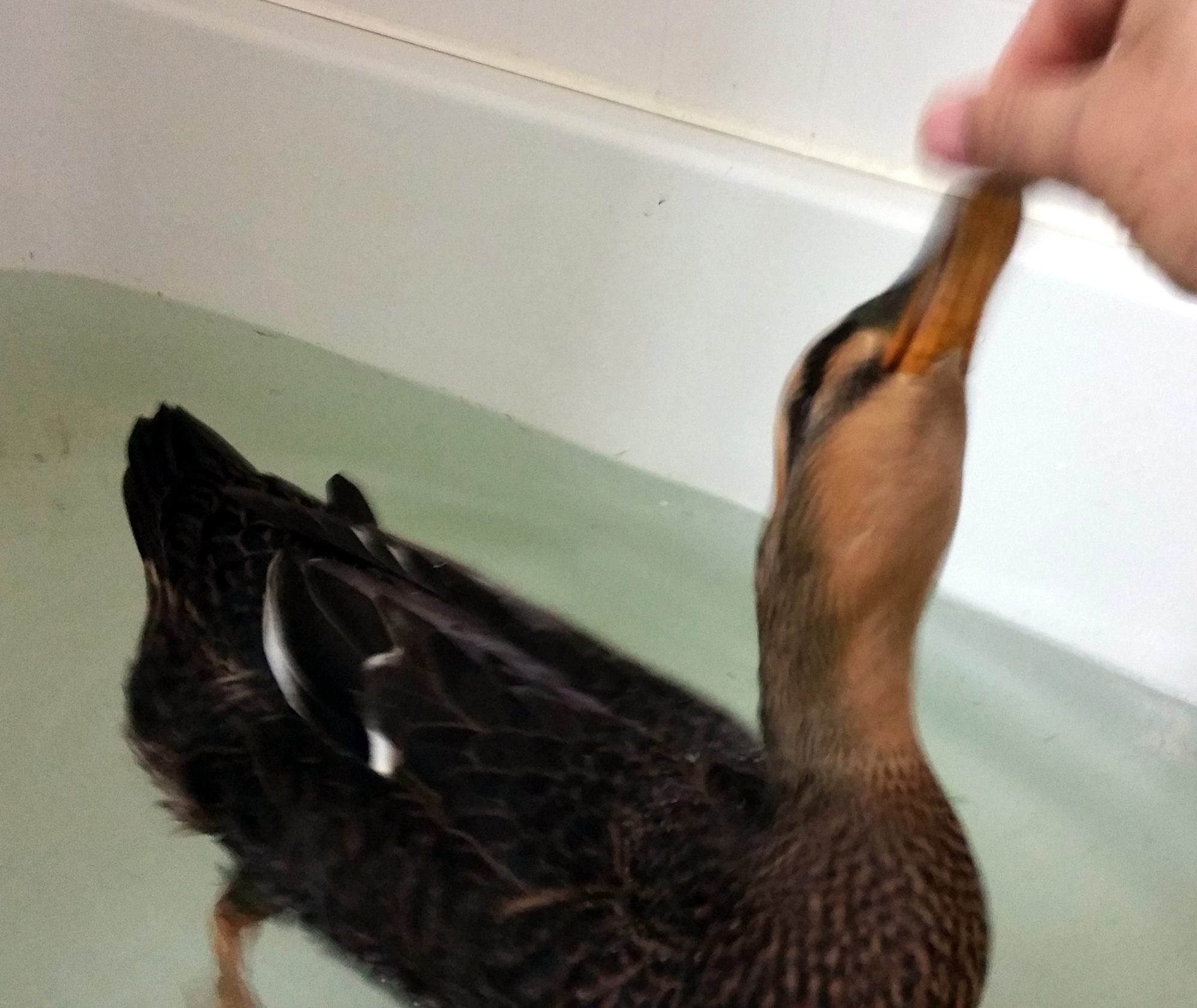 WeeeeeeeeBEEEEEEEP!!! Her face. I see the sweetness. Very feminine soft looking little face. So cute. I am envious you get to pick her up and hold her to place her in the tub. She is a wonderful girl. Look at her pancaking in her sleep on the socializing blanket. Angel. The personality difference between the two is amazing. Just goes to show why non human beings are so incredible. Thank you for the treat, Tony. Note her web on the tub floor.We had chapter 2 of the DOD program last night. This time our temporary house duck was Tella. She is Ettie's sister. They came from the same brood and were brooded farm style by their mama (who we never met). We got them at about 6-8 wks old. They are the only ducks that weren't brooded by us.