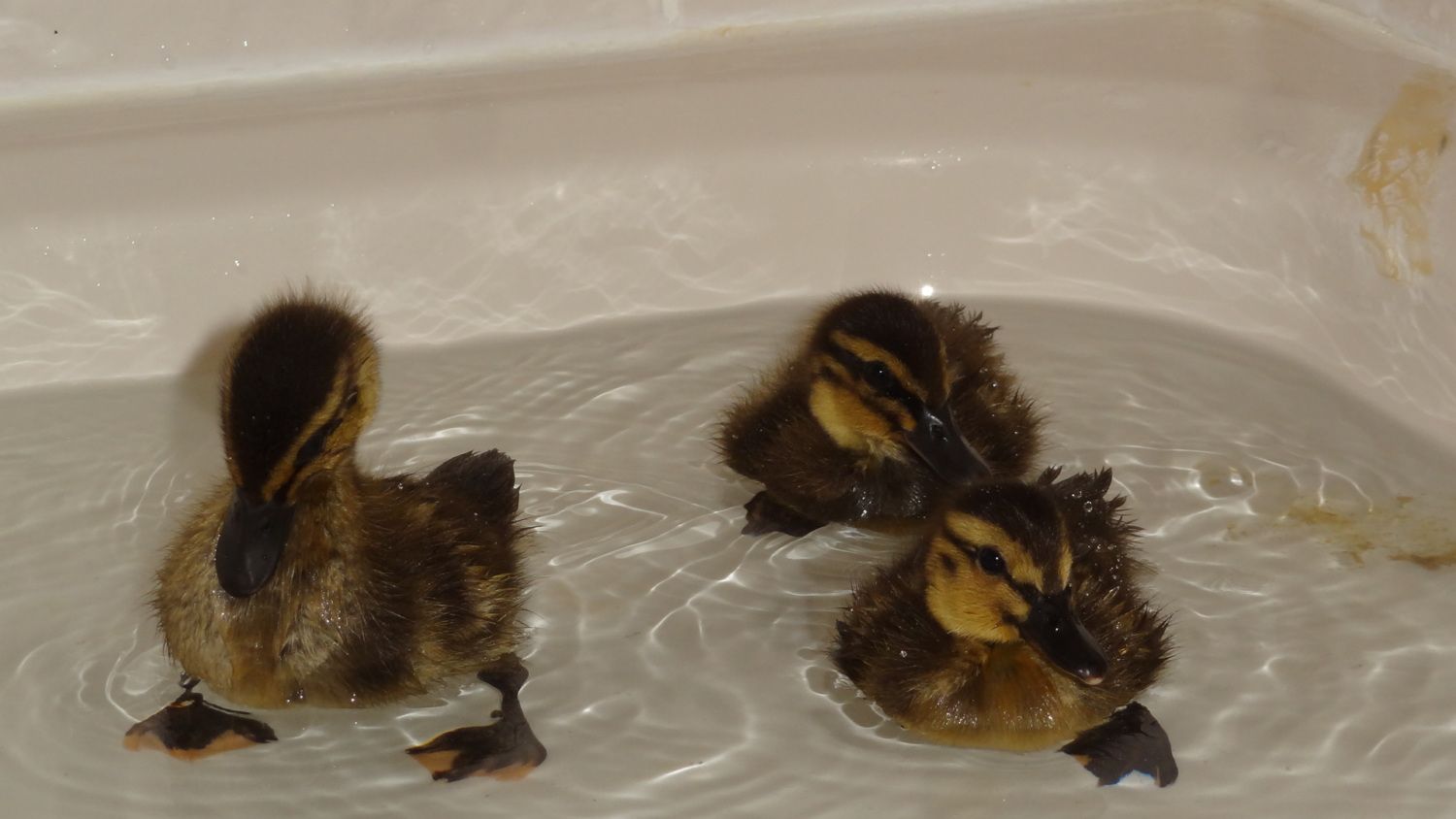 The one in the front is very scared of people. Eventually they calm down and start cleaning themselves. Just yet I let them swim for the first time, they LOVED it. Winnie and the scared duckling even dived