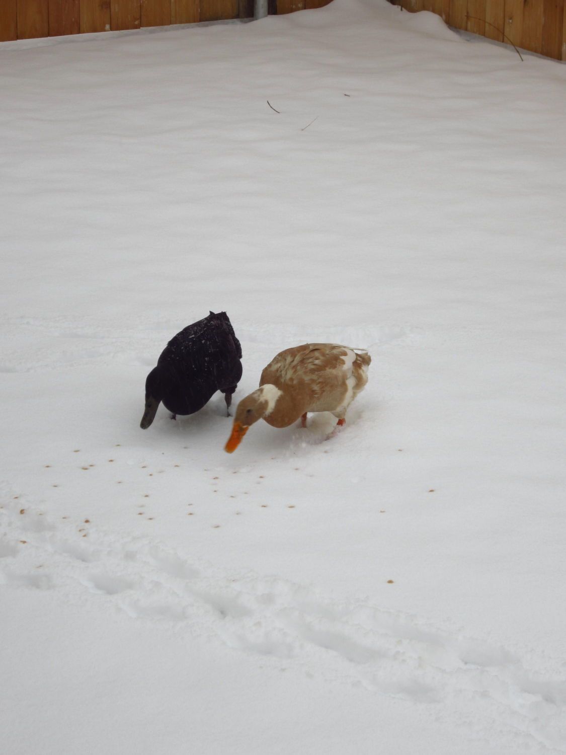 They are digging Cheerios that my boyfriend tossed out of the snow...at first they weren't so sure about the snow...they would wade through the snow, picking their feet up high like little soldiers before plopping down...