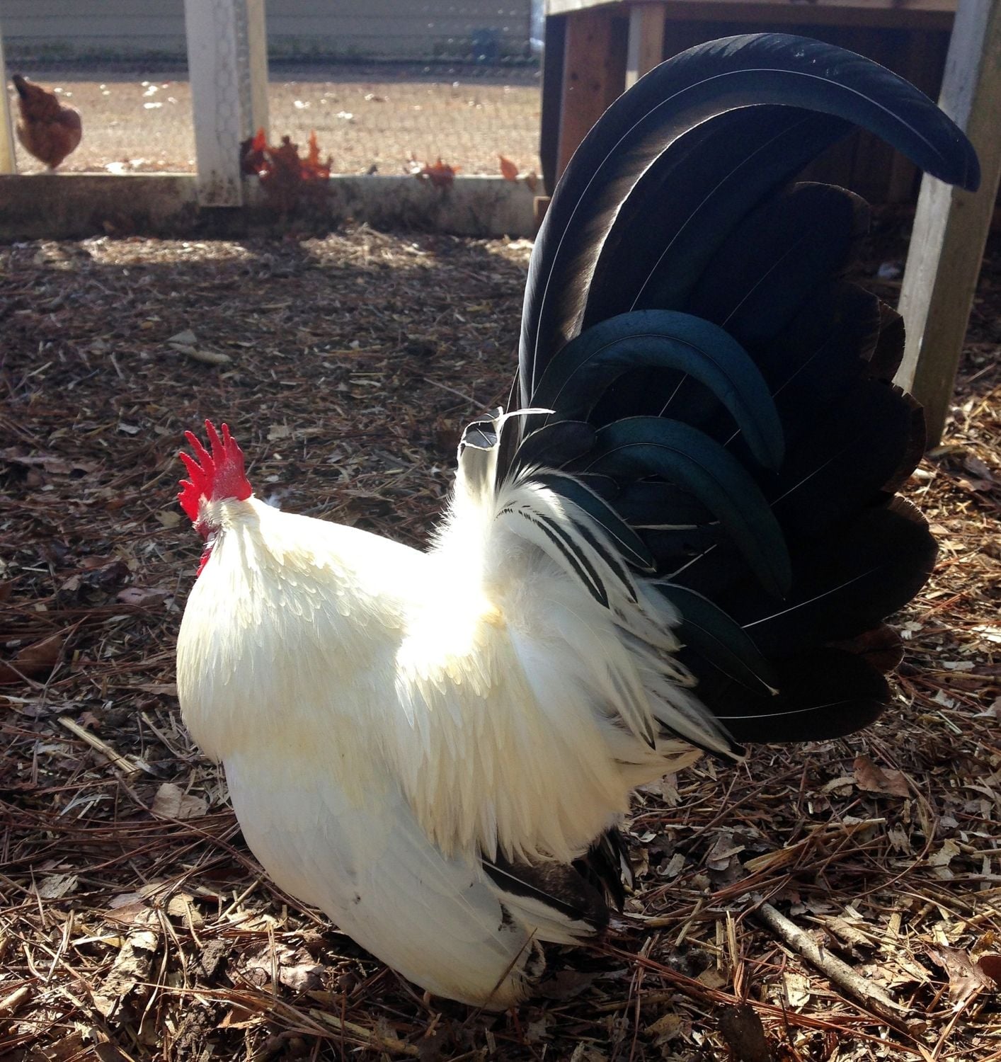 Also very nice! I just got a little Jap mix roo myself, but he's nothing worth looking at right at this moment, lol, he's in the latter stages of moulting... But he has a nice long tail, though nowhere near as curved as yours.