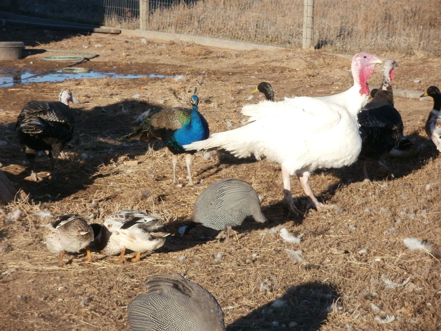 Very nice flock! You should get some peachicks this upcoming breeding season since your boys have eye feathers. In the lat picture, that white tom makes your peacock look tiny! That is a huge tom!