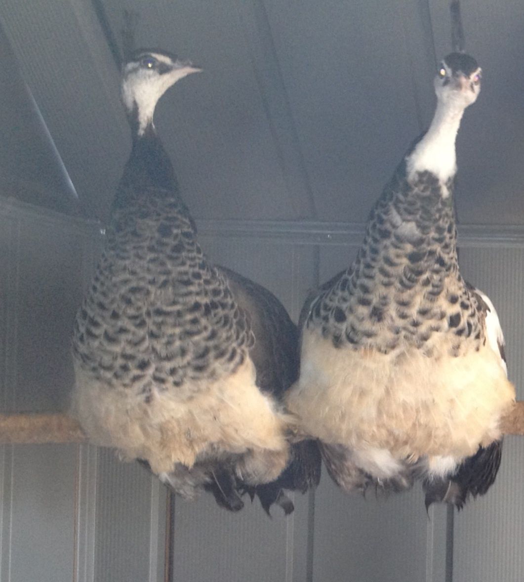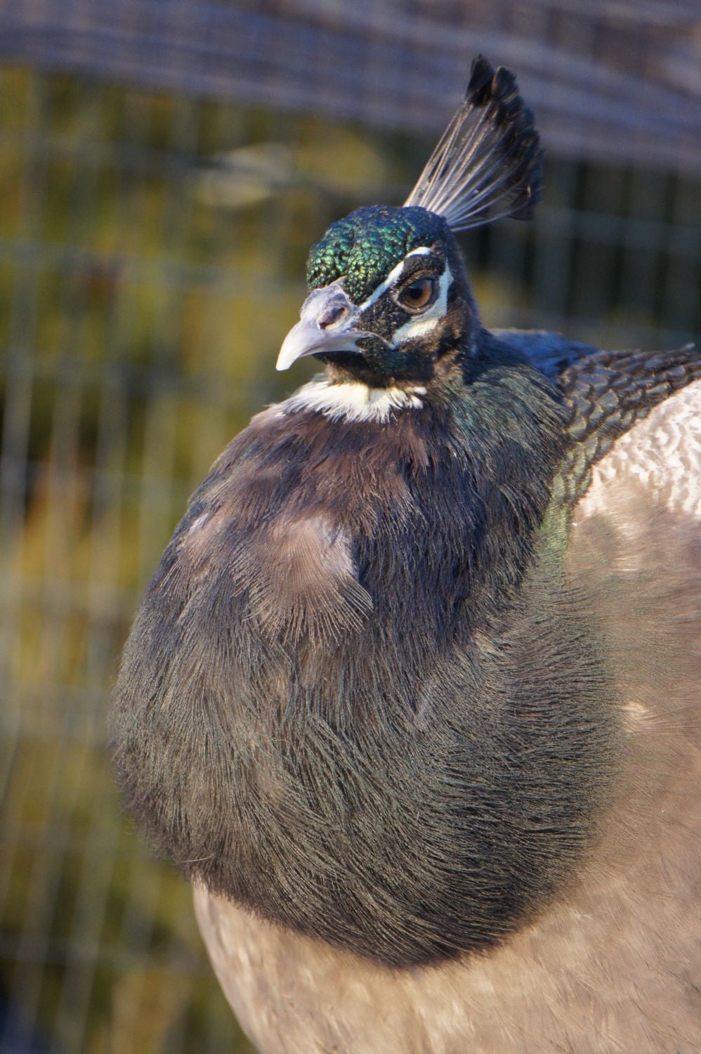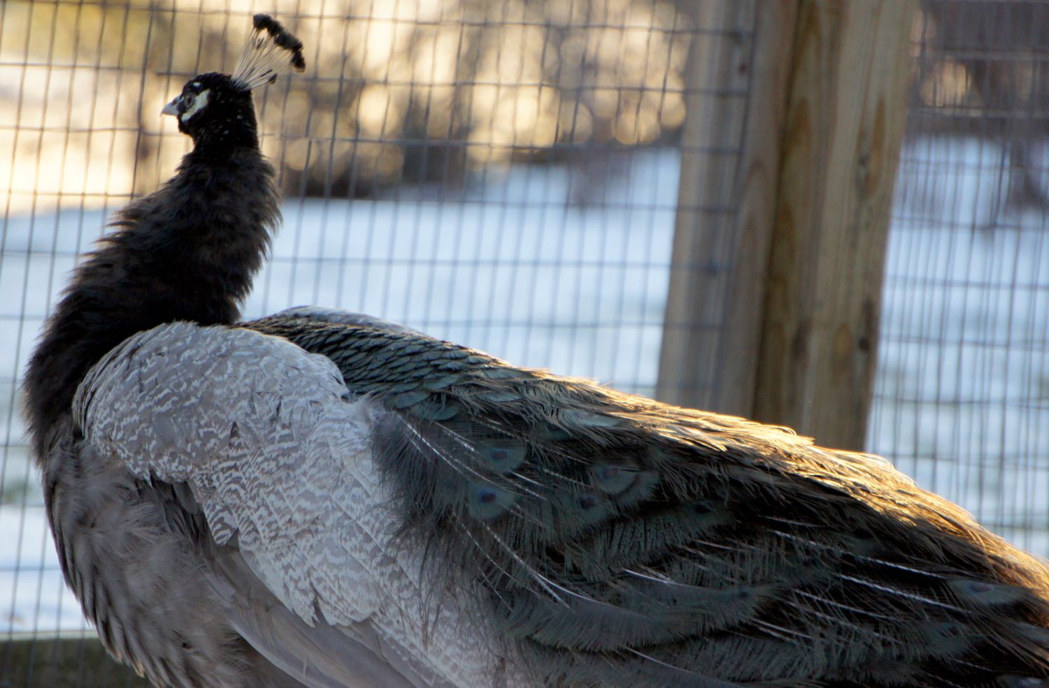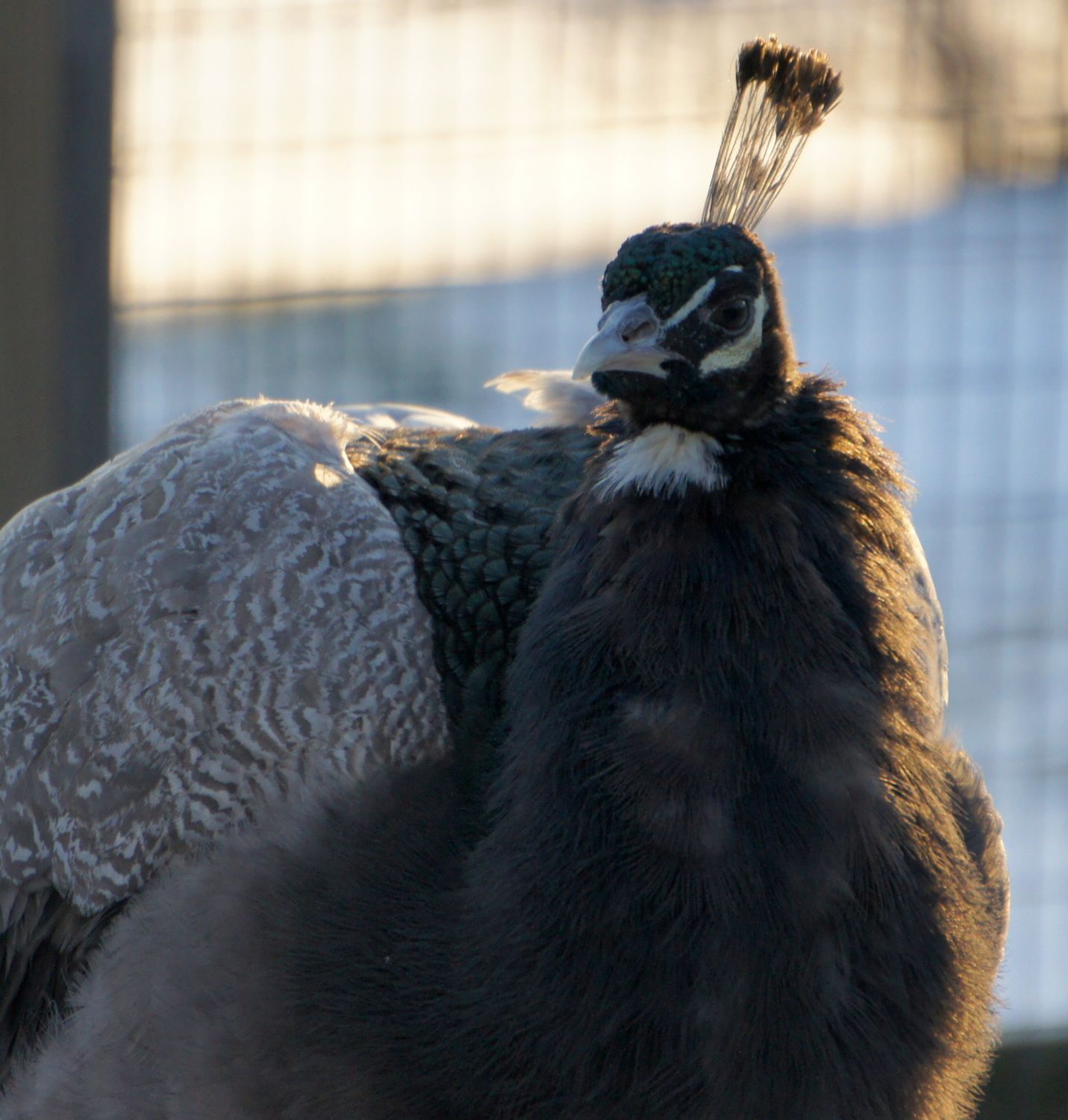 Beautiful peacock!!!Here is my Opal WE peacock. He is five years old this spring, but it is interesting that there is a feather that was noticeable in his train that is what I expect from a first train. I never had an opal peacock, let alone a WE peacock, so I really like him! Some people may think an opals train is drab, but I think I captured the colors quite well. His neck was rough looking, but he is finally done molting and looks nice. It is just too cold to be taking pictures. My peacock has very nice white eyes. I have never seen his display. He is afraid of the spalding peacock he is in with for the winter.