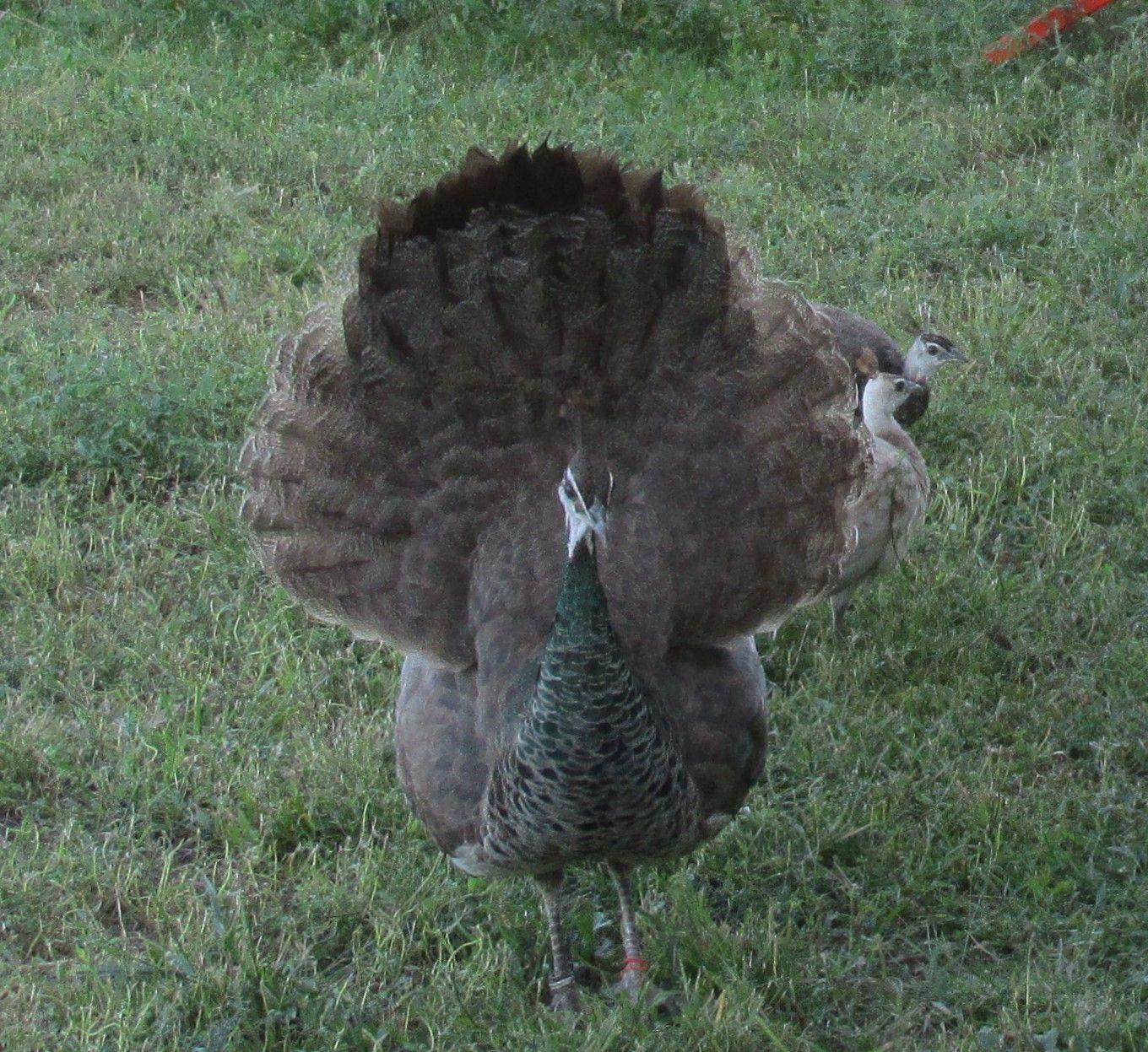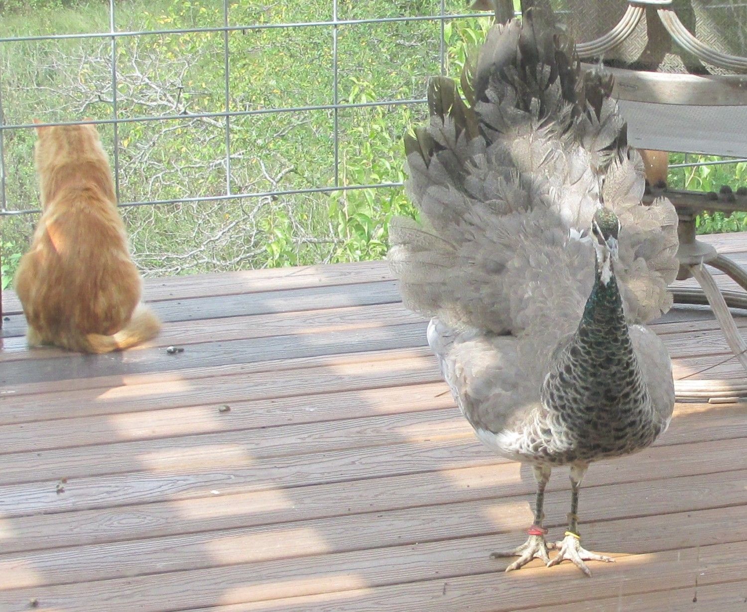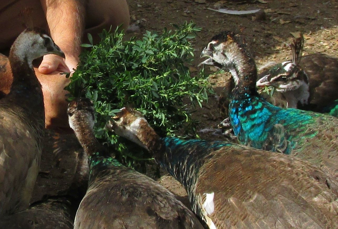 I think my Big Blue (peacock) was getting his revenge! When he was little the guineas picked on him. The table has turned! Just watching them this morning the peacock is doing the picking. I think he might have done the damage to the little guinea!