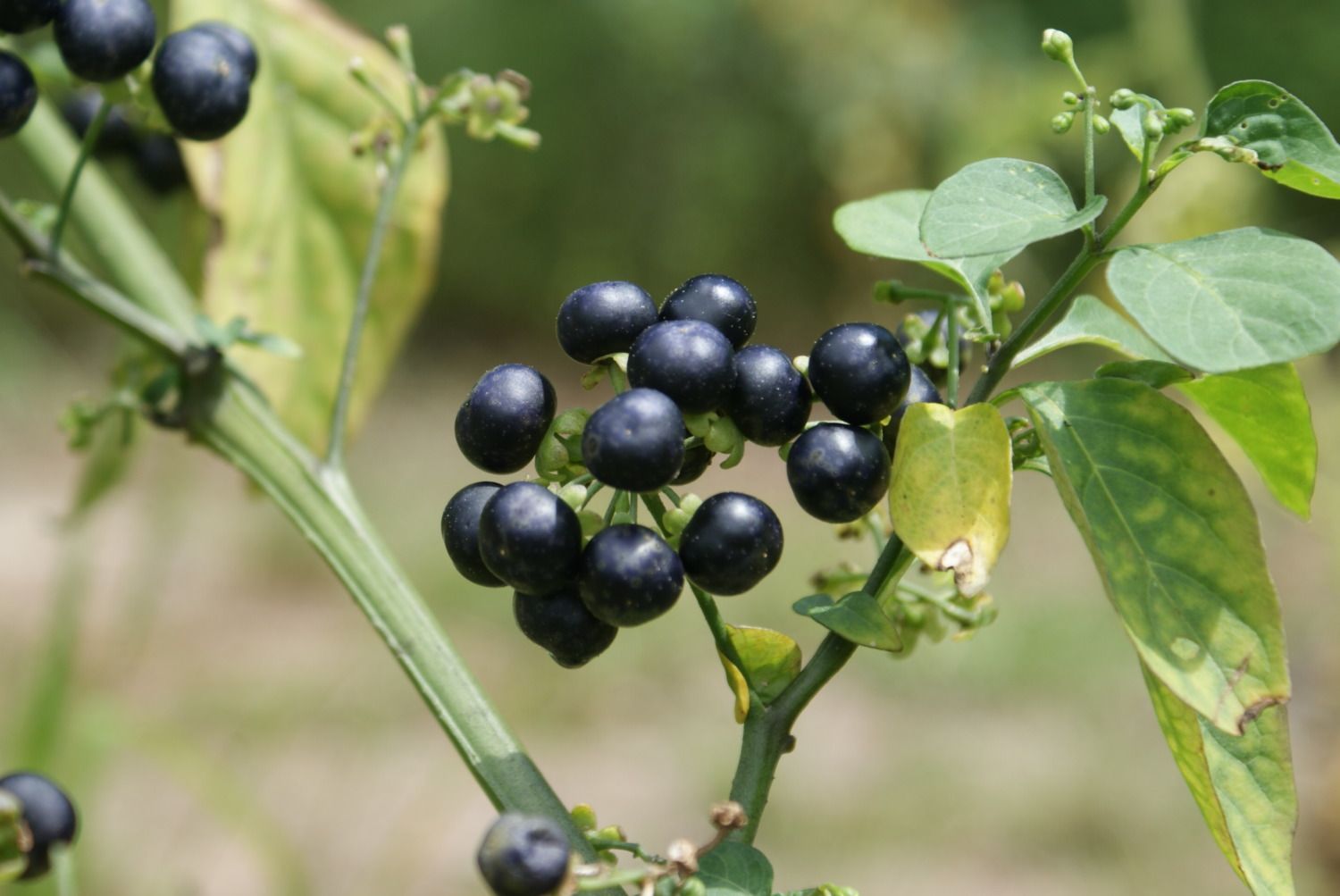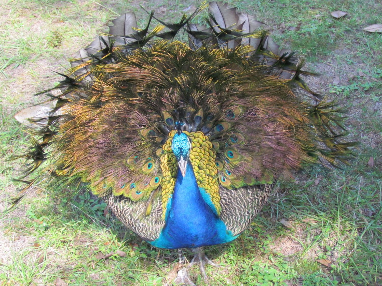 I let Peep out of the pen for a little bit and he ate some berries off of a large pokeweed bush and then later he started displaying. The peafowl love eating poke berries.