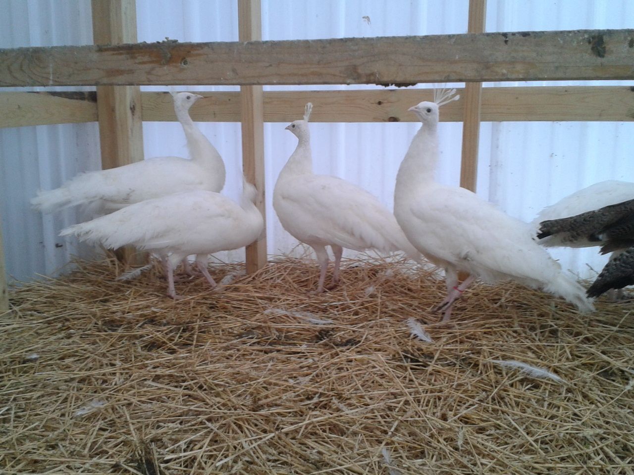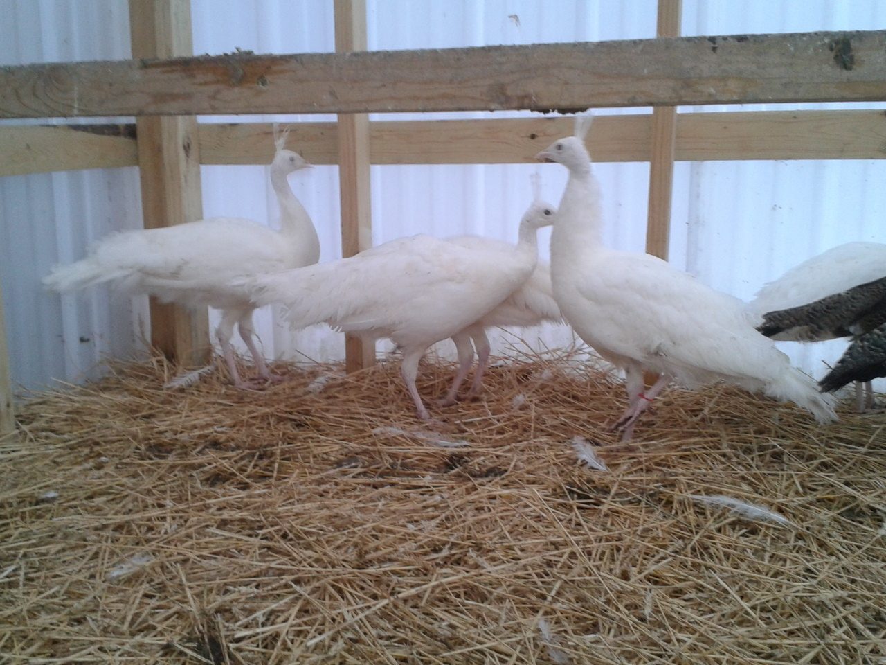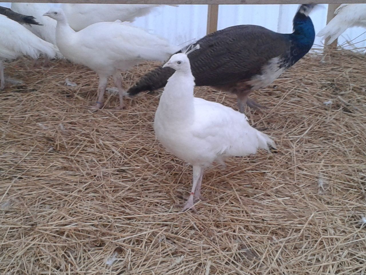 two of the seven are banded with a red and a blue tie...the rest are not marked...just wondering if anyone would make a guess on the sex of these birds...I have no ideaAre most of those photos the same two white peafowl?