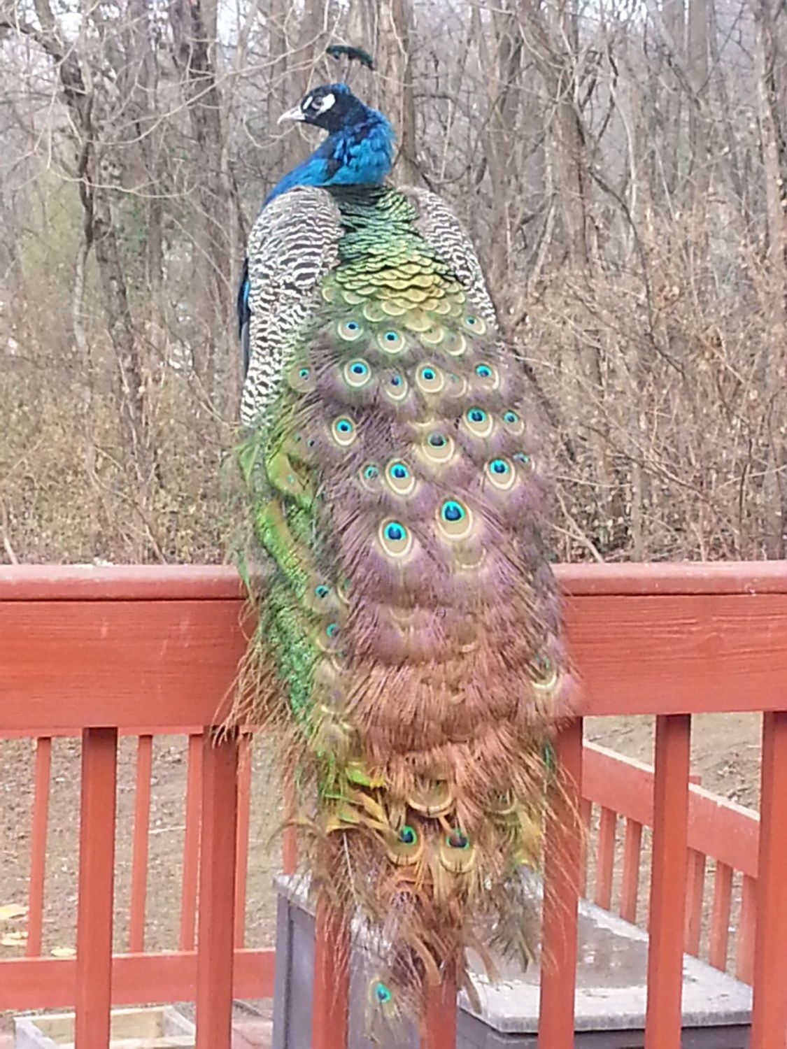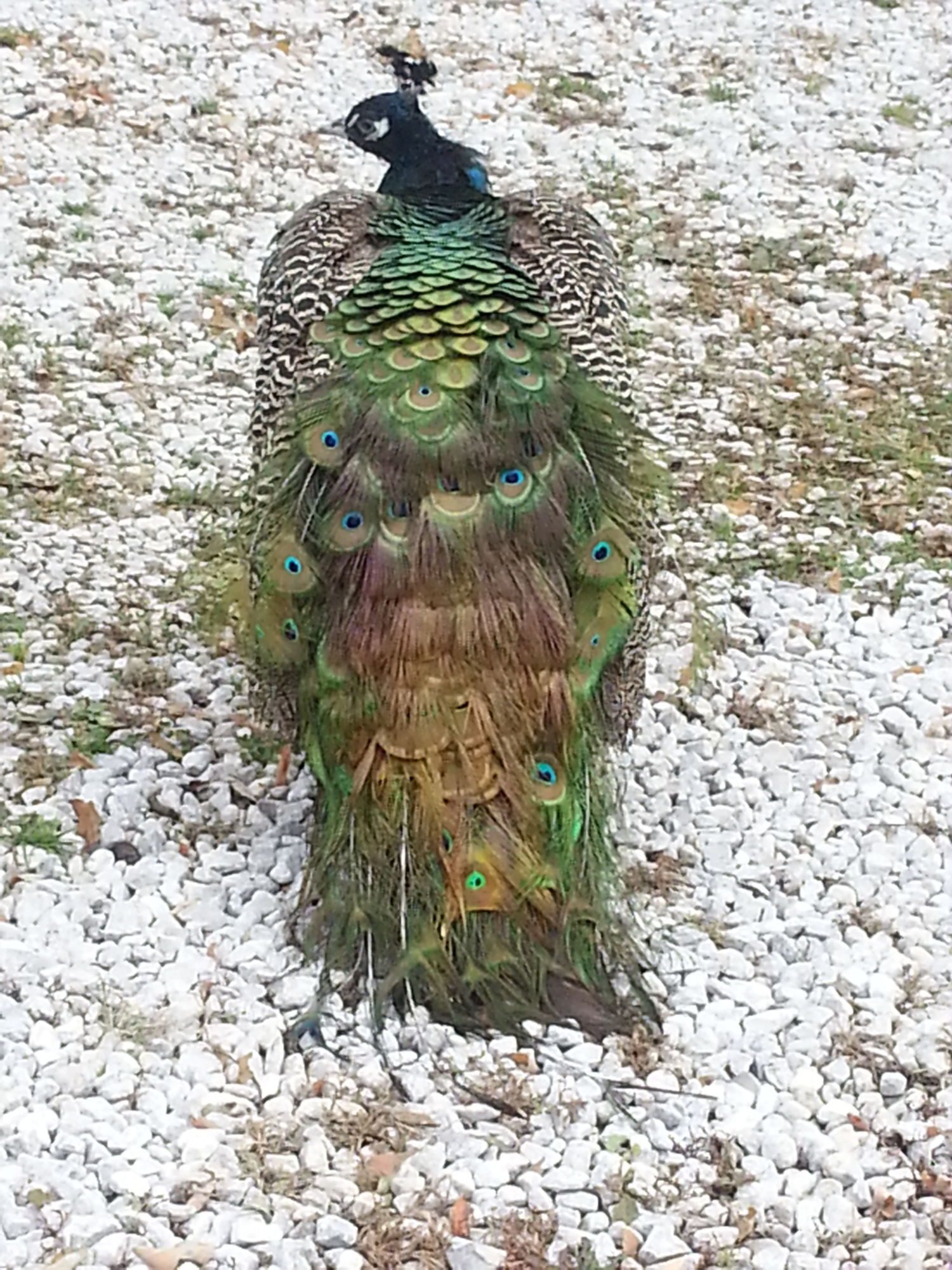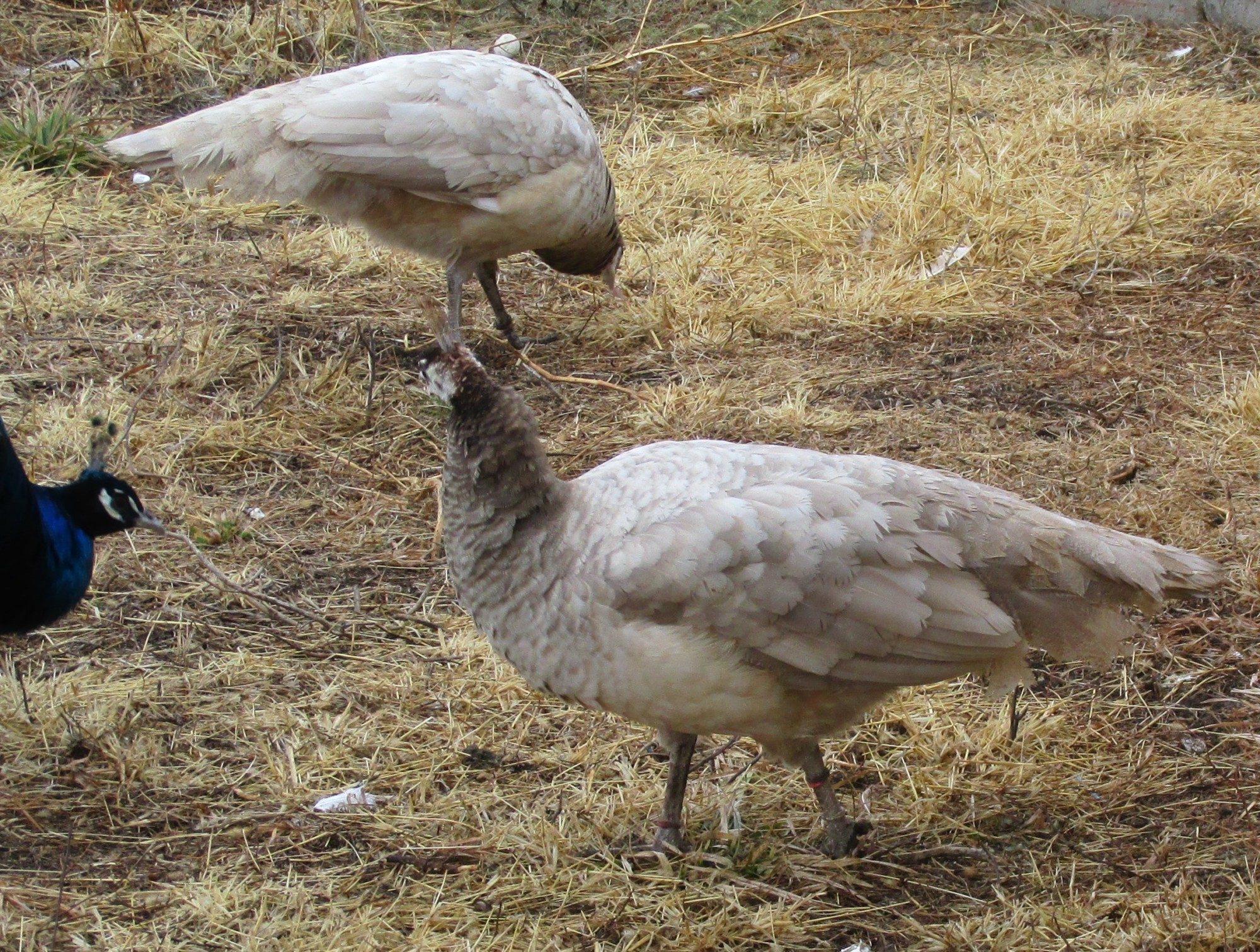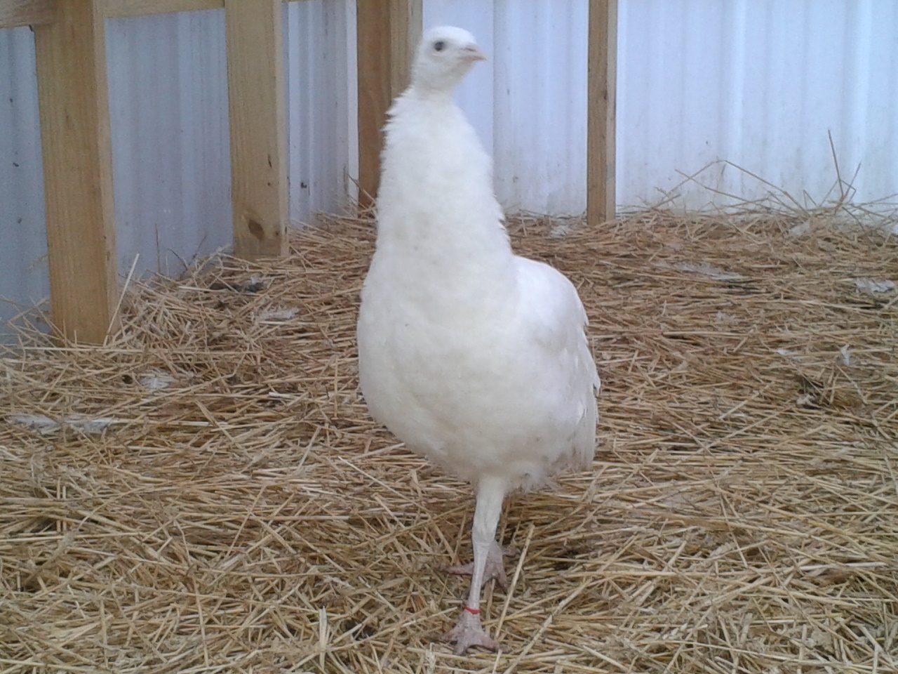 two of the seven are banded with a red and a blue tie...the rest are not marked...just wondering if anyone would make a guess on the sex of these birds...I have no ideaAre most of those photos the same two white peafowl?