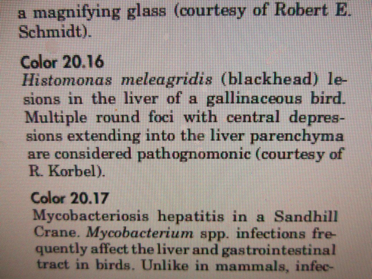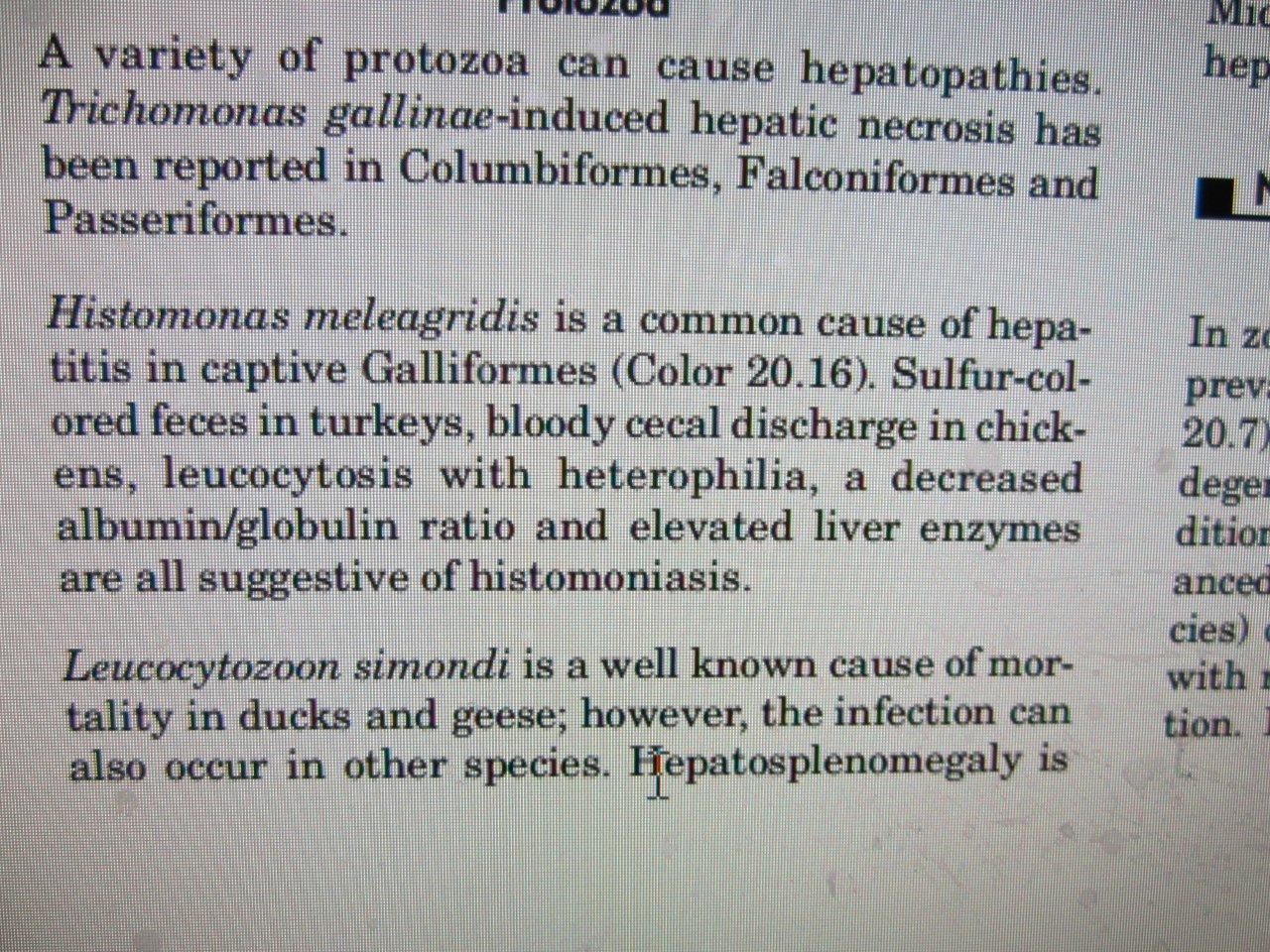 I have the Necropsy papers with me and if it was histomoniasis they would list it. It was done by a vet. It says Enterocolitis, and Hepatitis.
