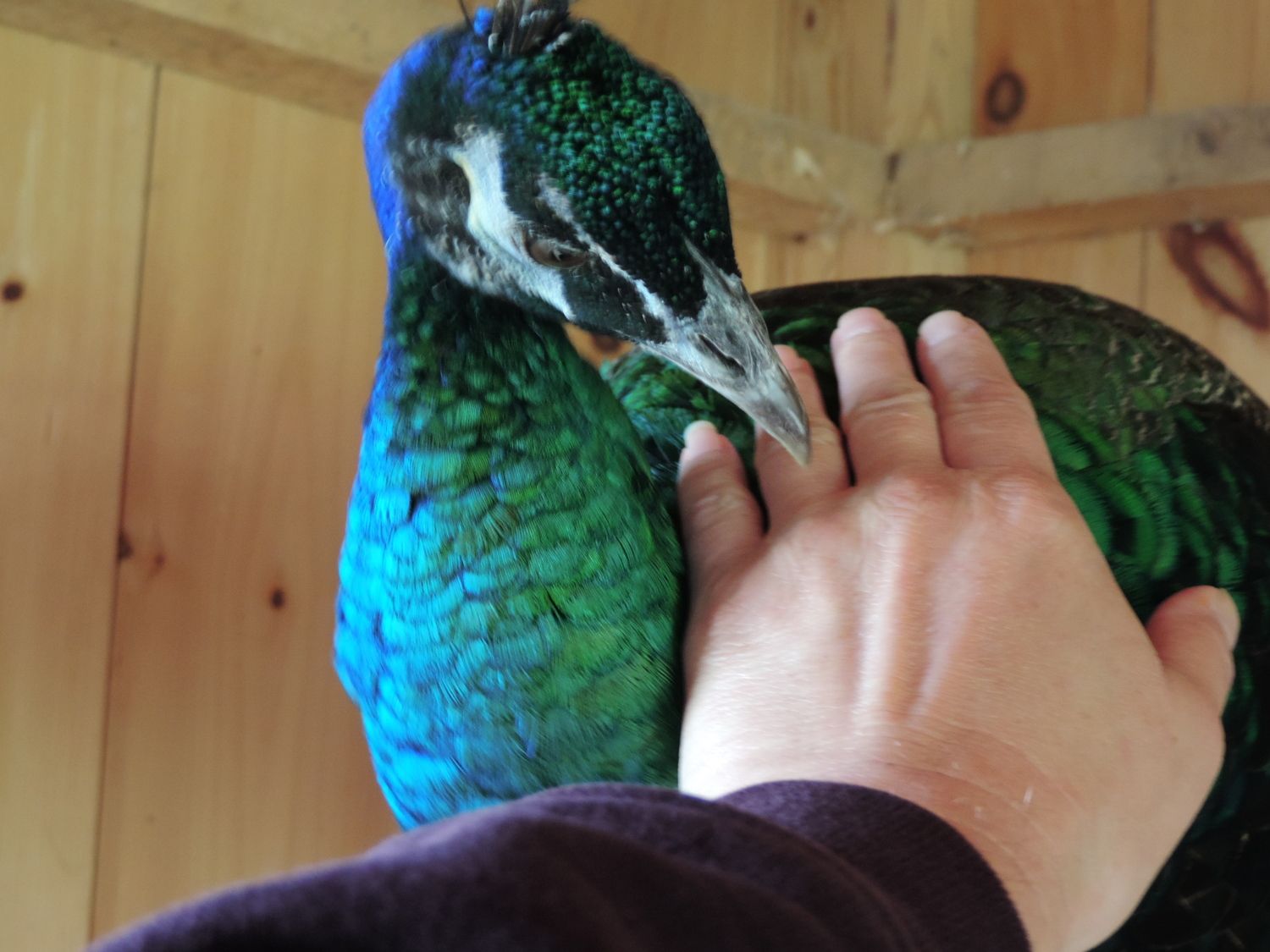 Touching is not the peacock way if you watch them they do not go around touching each other, might preen a bug or some feather dust but they do not hug and hold each other, now it is ok with them if they touch you or steal your things that is when you know they are very tame and that is good enough for me i have dogs to love on when i need to touch something and they love it.my peas are getting better about people i walked right bye both of them and they didnt even care but they hate it when i touch them so i hope i can once they get bigger