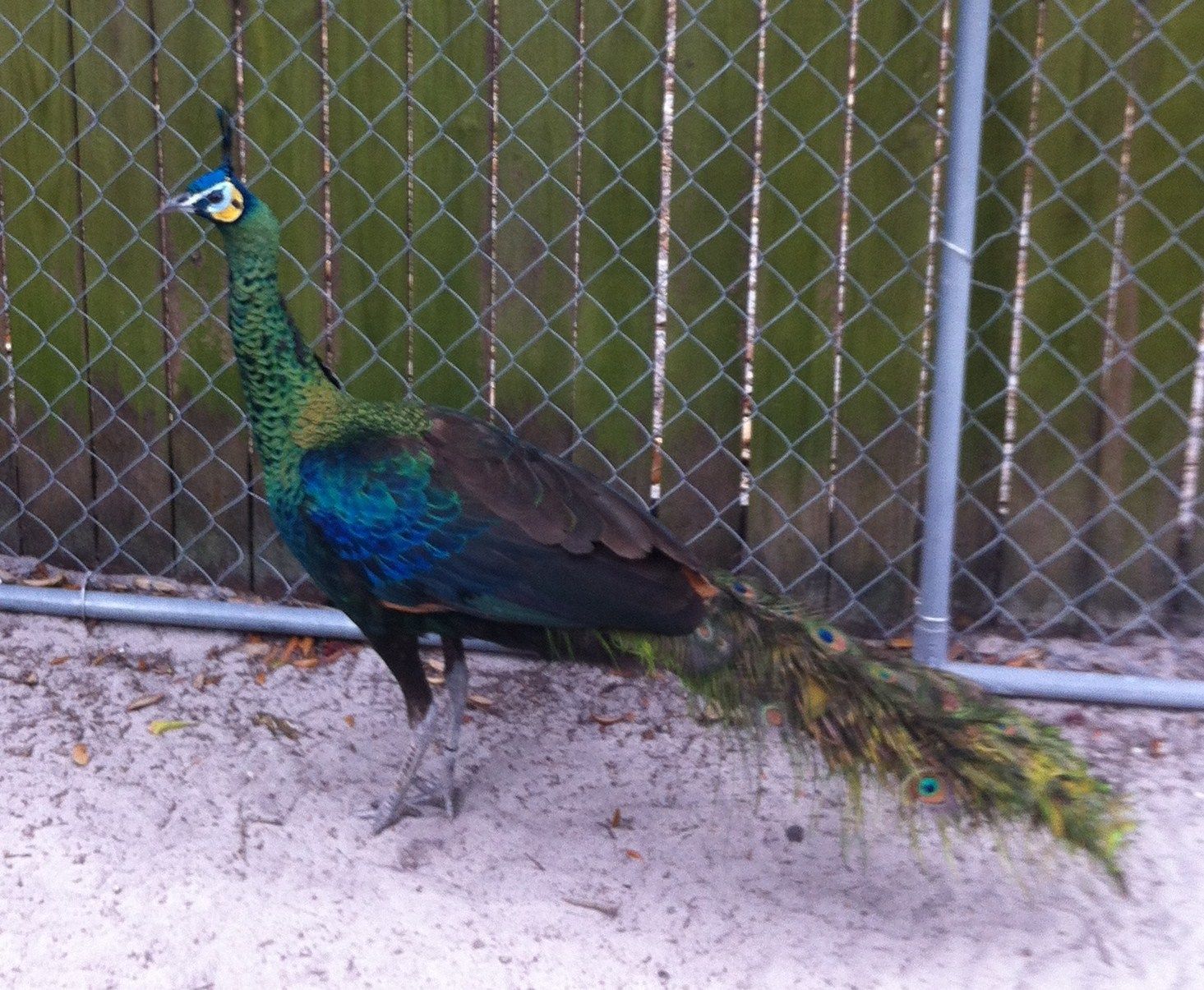 Haha Peep is very friendly. When I am on a lader working on the pen netting over the roosts he flies up on the roost to watch me work and I pet him while he is up there.