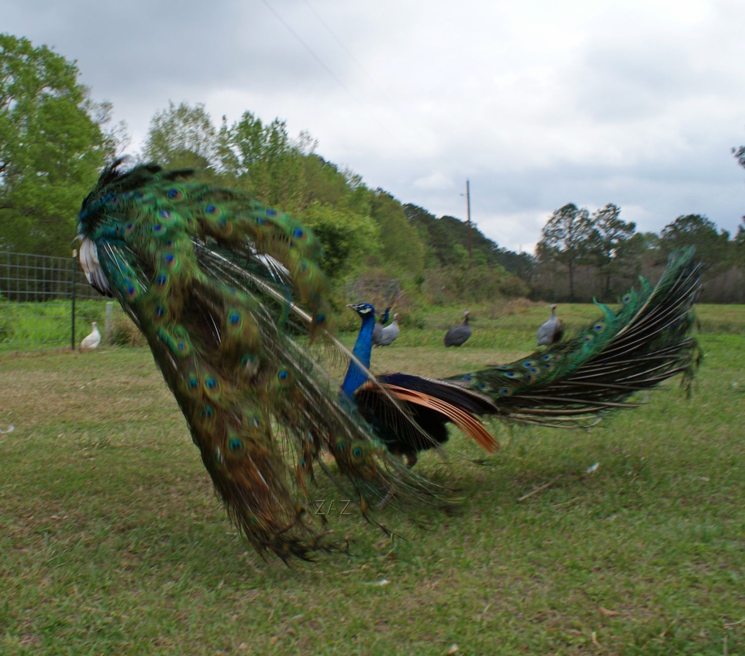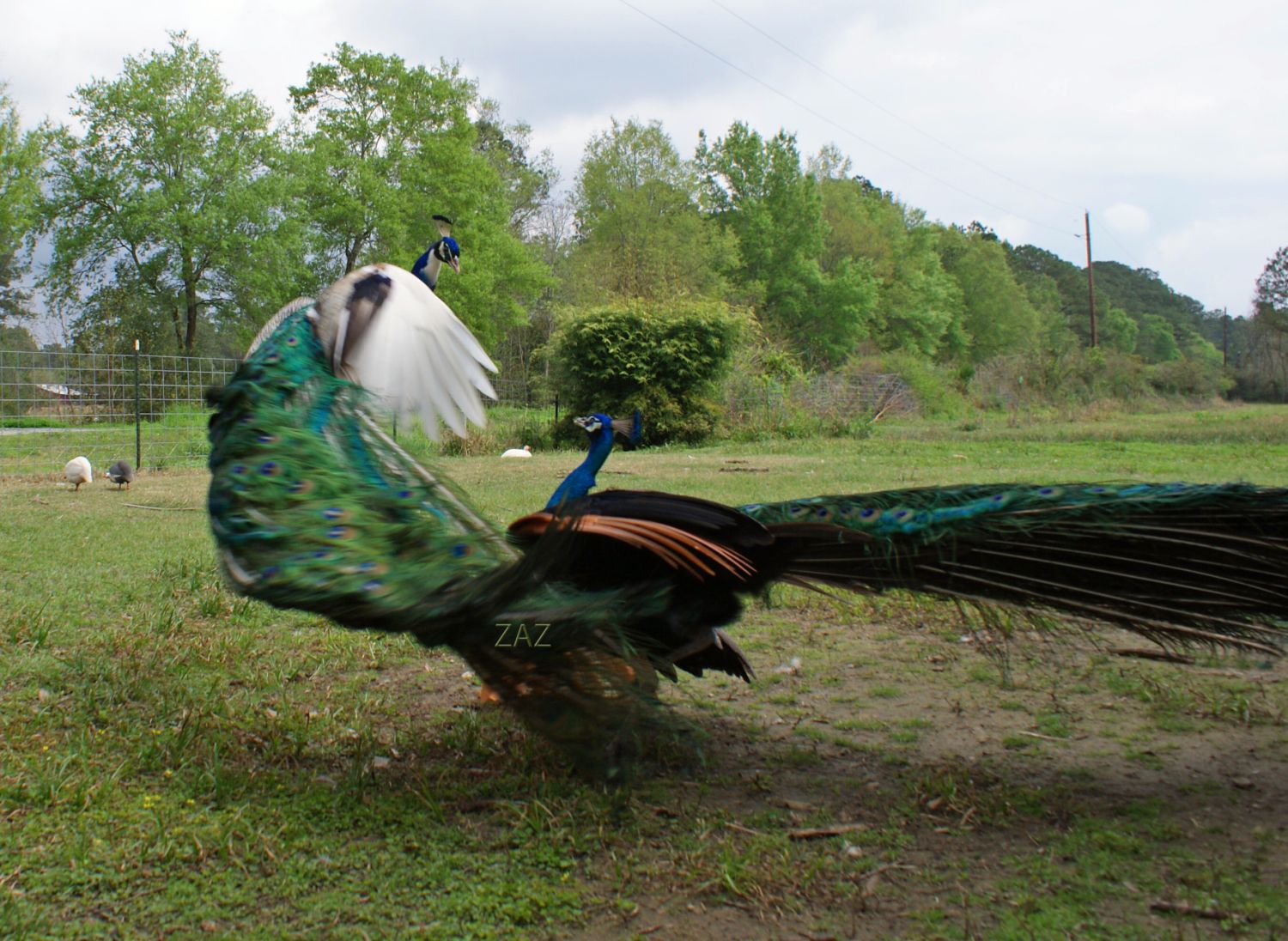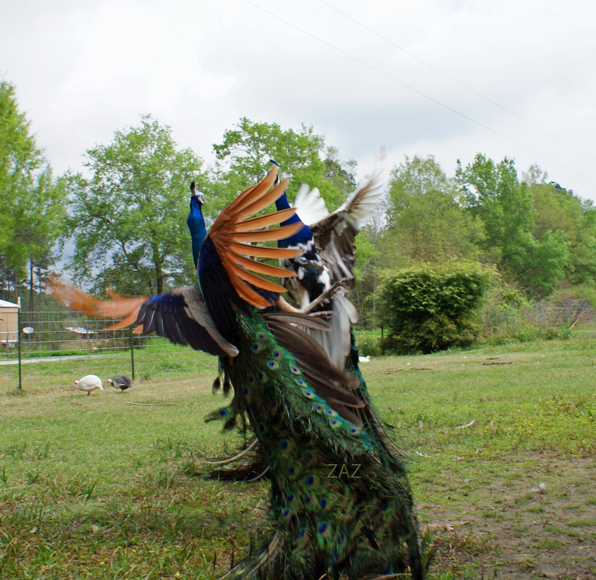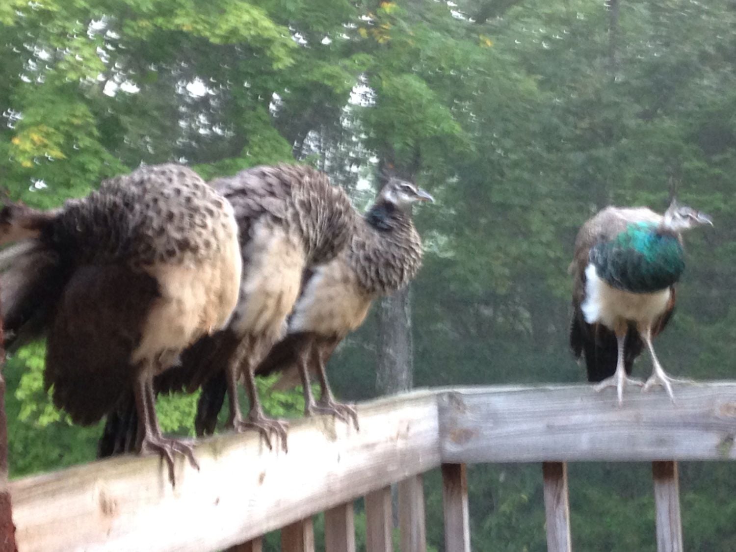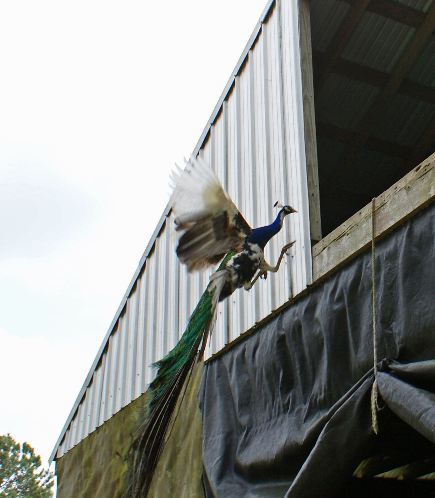 I posted this in my local forum but since it's pea related thought you would all get a kick. Angel, my white peacock on the roof with some ladies. Hen the one on the corner squatted for him, he wanted to be accommodating but just coulnt figure how without rolling off the roof. The spectators didn't help his frustration!