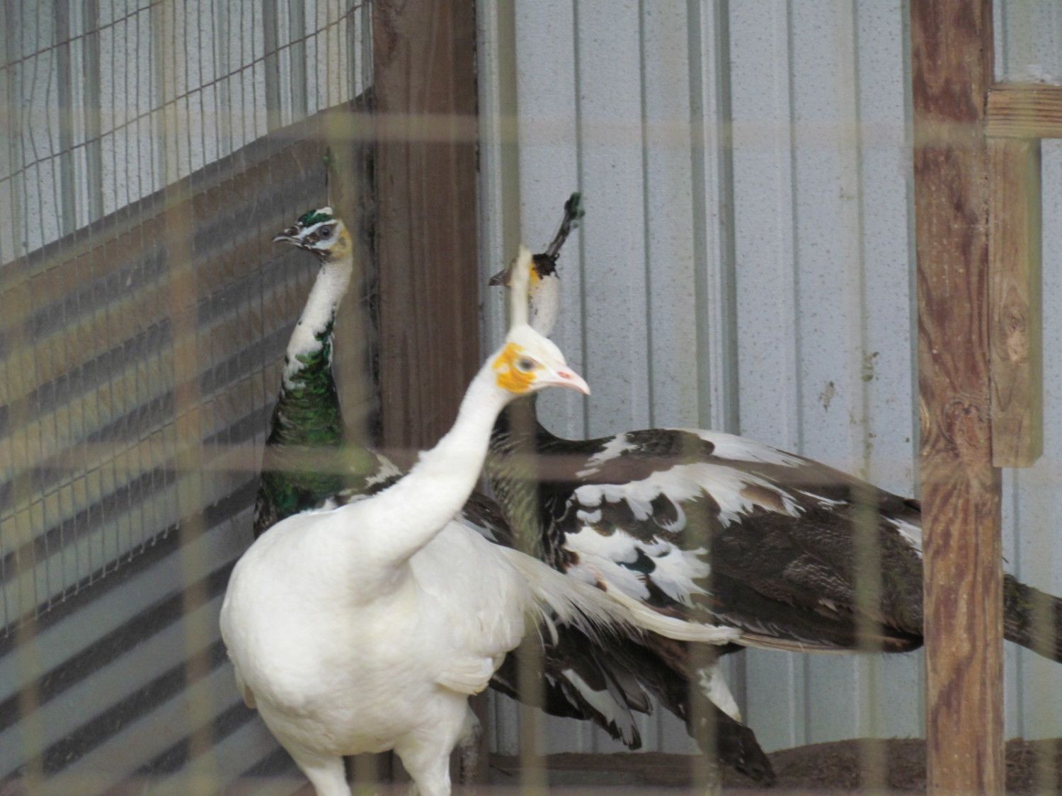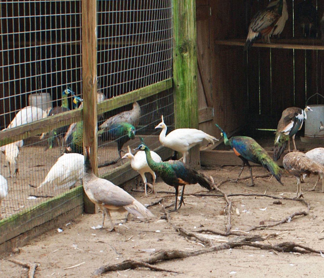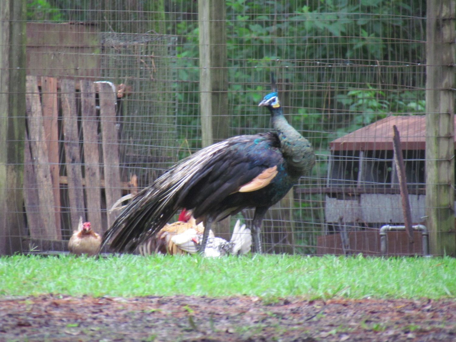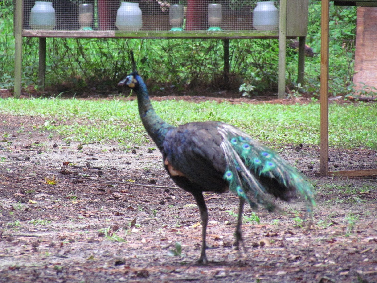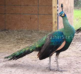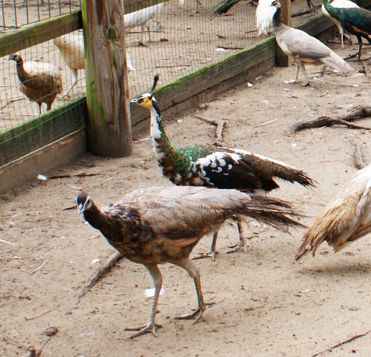 I think some of them are Burmese. I didn't get a good look at them this trip but for Farm Day and I think the previous farm day too some of the birds in there looked like Burmese to me. I don't know for sure though I have only talked to Josh about the greens in the long row of green peafowl breeding pens. He has gotten so good at breeding high % spaldings that I often second guess myself and am not really sure what I am looking at. If you tell me it is a pure green I can then usually identify the subspecies (especially in person), but it is harder for me to say if it is a high % spalding or a pure green. I was looking at a free range peacock and thought it was a green free-ranging but AugeredIn asked Josh about the bird and Josh said it was a high % spalding. Here is the bird: