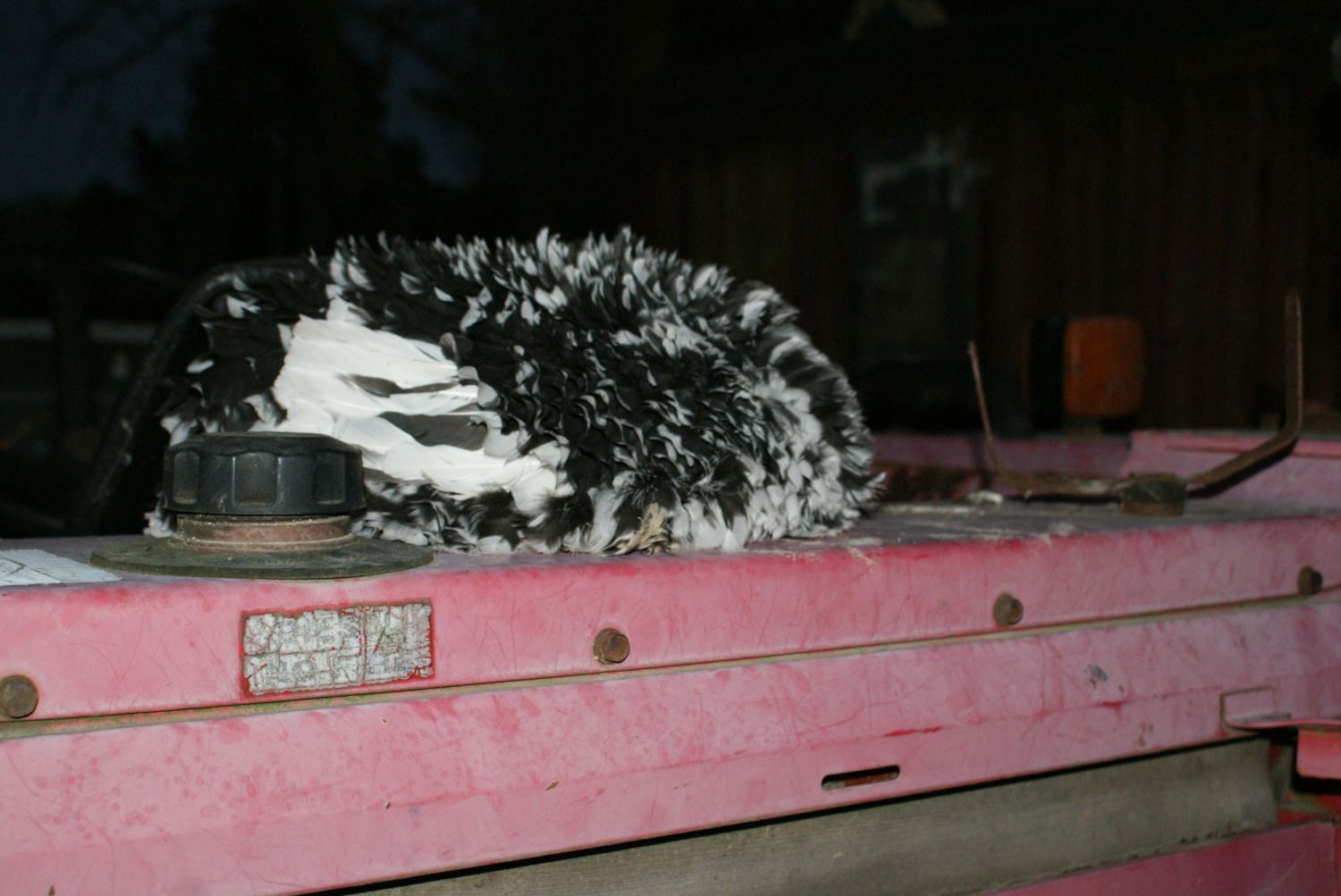 Hiding in plain site sleeping on one of the tractors. Please turn off that light i am trying to get some sleep. Baby duck time.