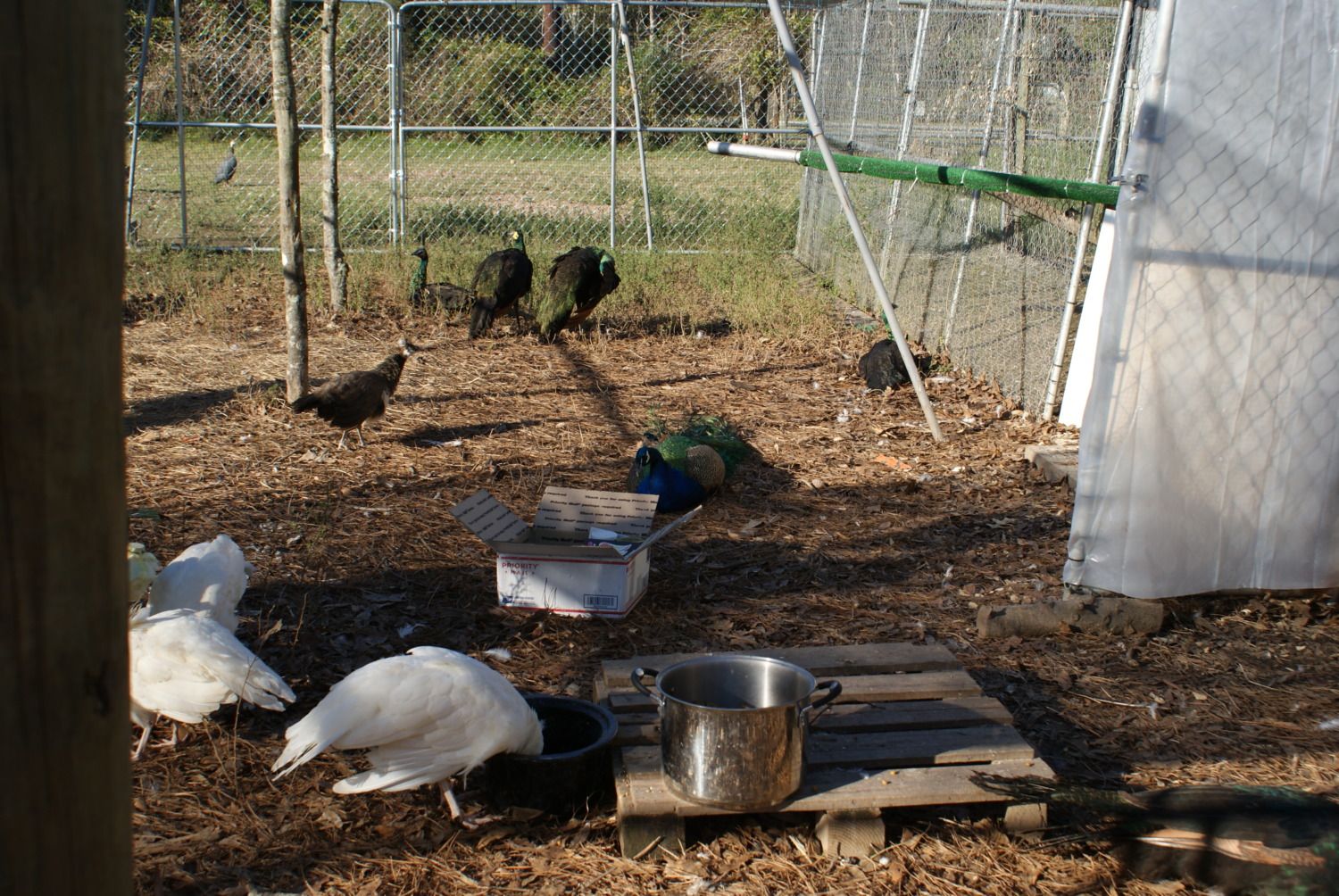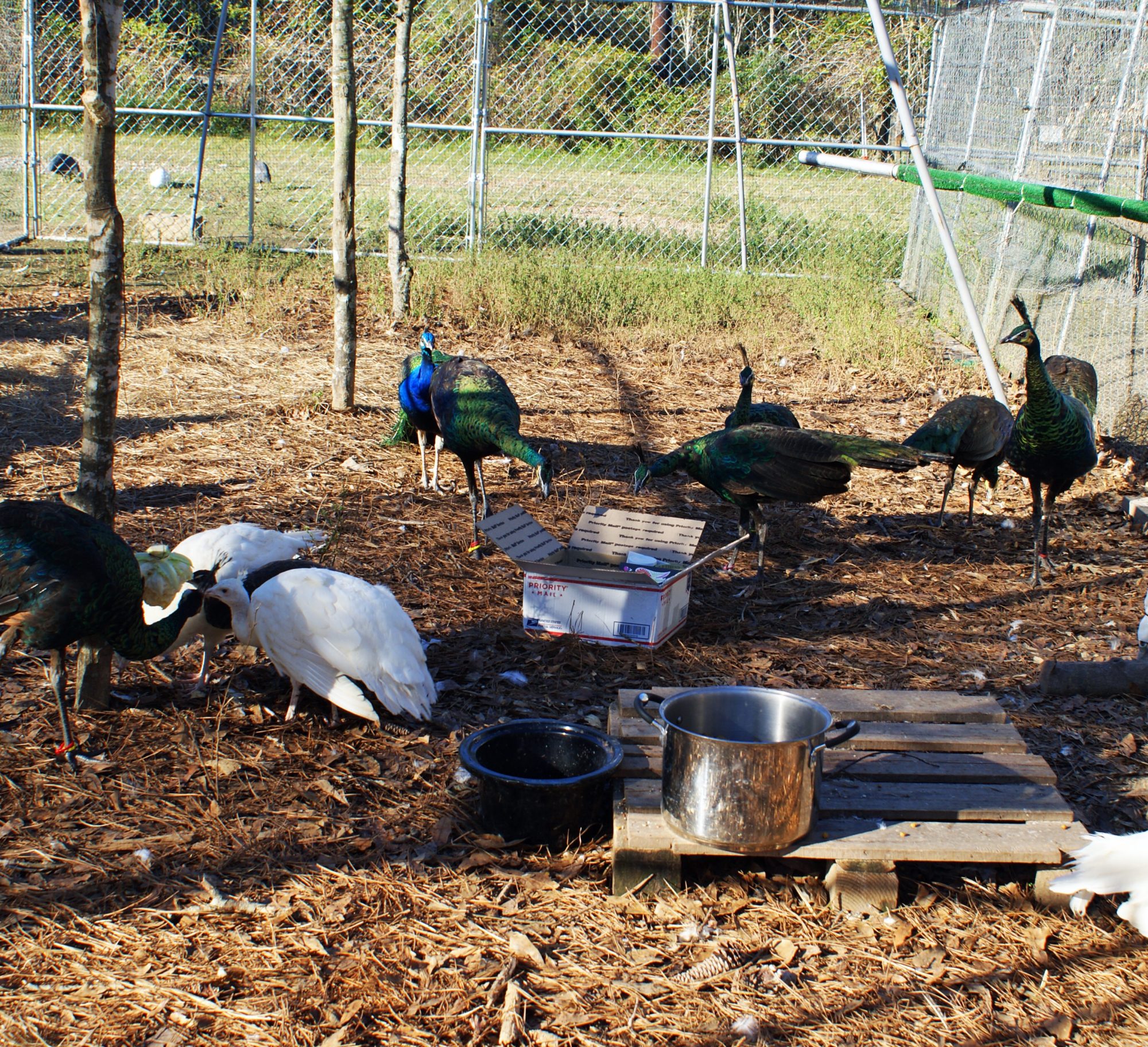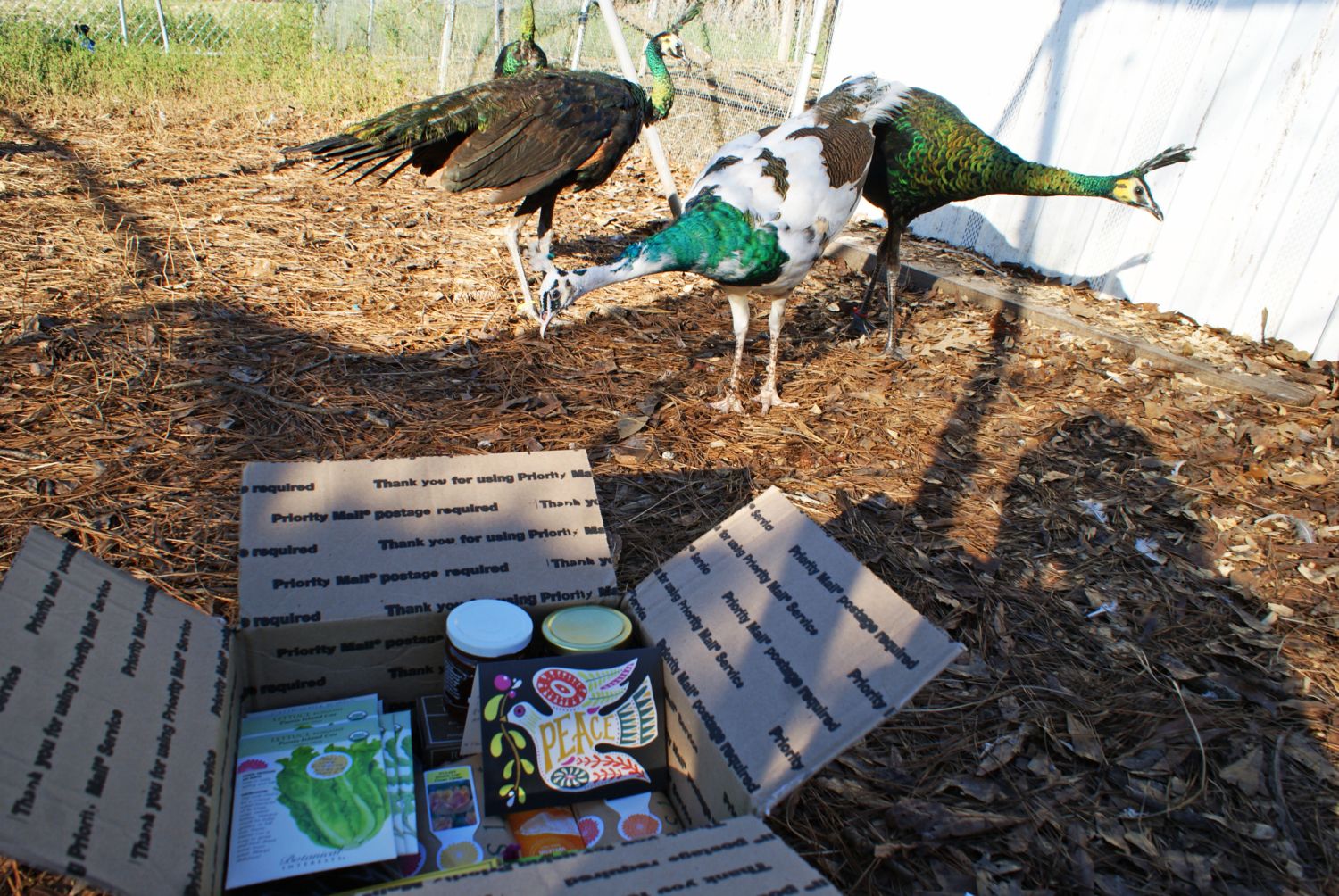 The green beans checking out the gift box we got from New2 peafowl (Peggy's Mom)