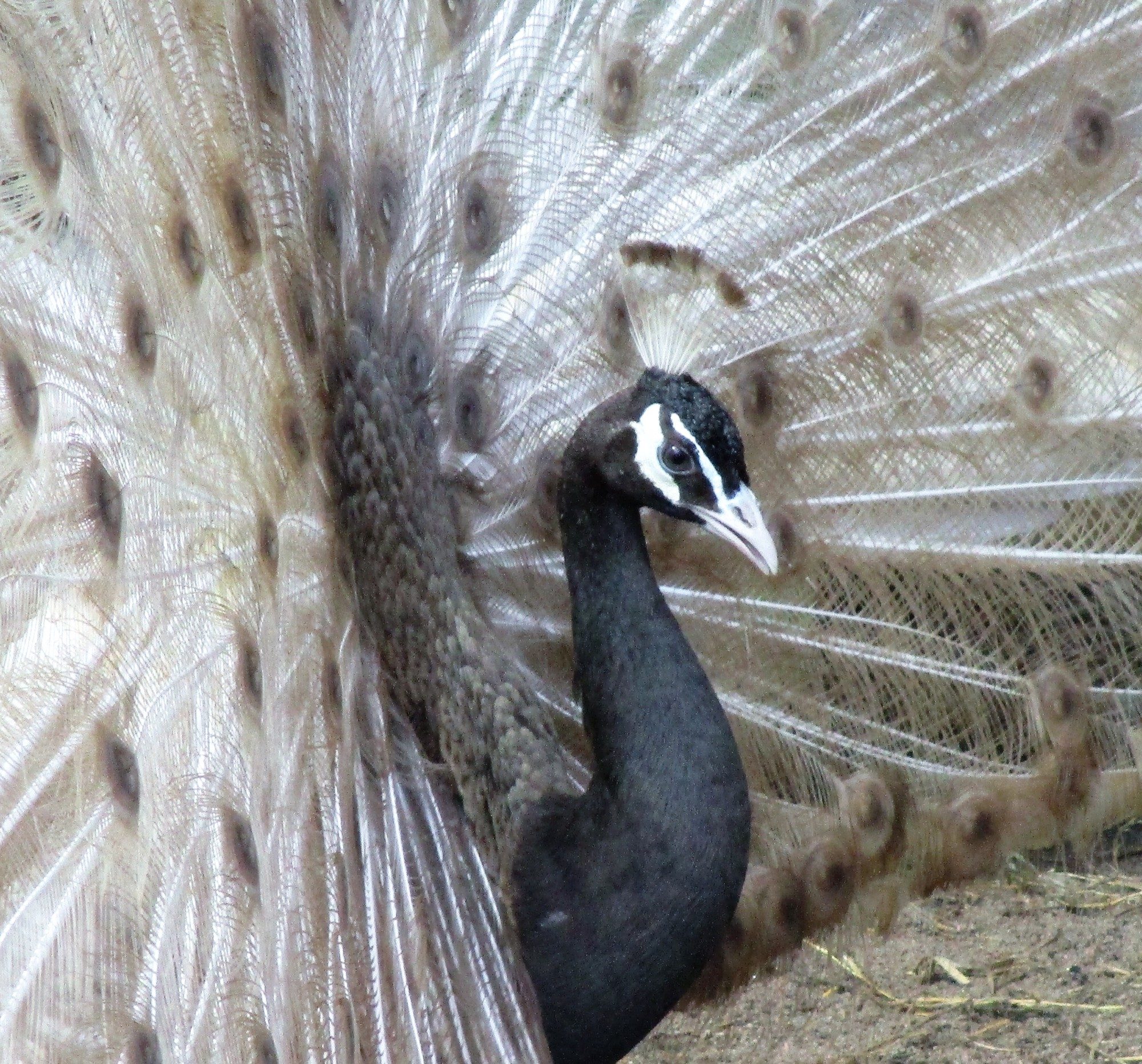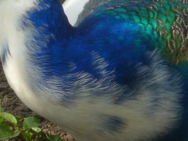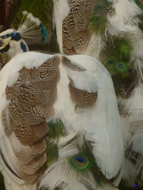 These rather unspectacular photos are an attempt to capture the green and bronze sheen from my peahen's tail coverts.