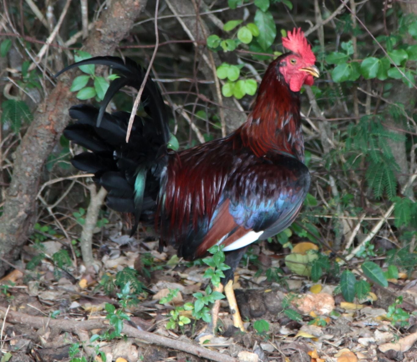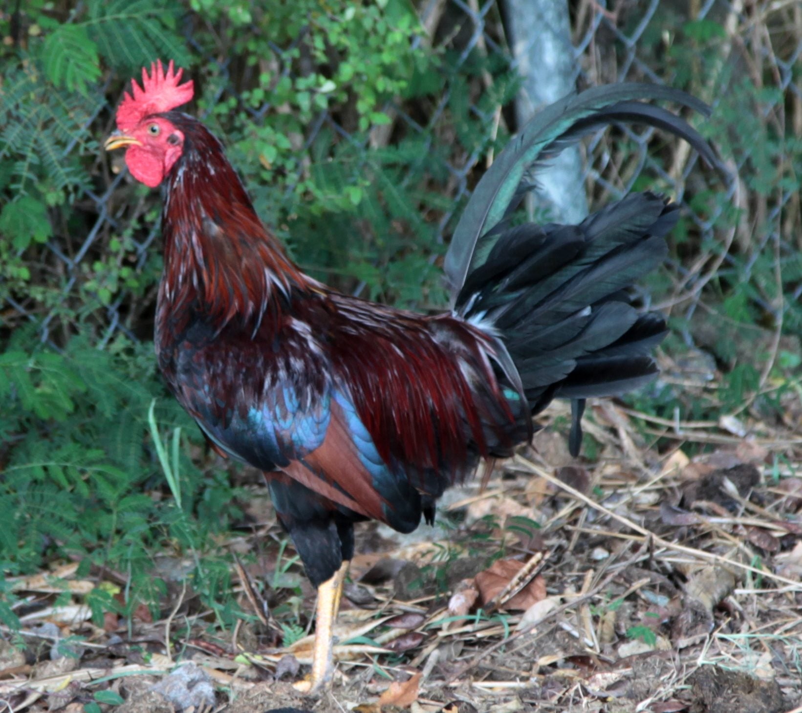 Awww a horse that loves your boy! That is so cute.My horse, Crescent, must get most of the credit. She shares all her food with him, well, except for bananas and mangoes, chases him off when they are given out. lol I have to throw his share about 20ft away and keep her busy. He gets lots of coconut peelings, think that is where the gleam comes from. Can't wait to see what he looks like after the next molt. He can not be more than 5 months old now. I have a feeling all three birds are local breeds. They do a lot of breeding here in the islands and it is a thing of pride to come up with a new, consistent breed. Next time I am at track I will have them write down what they call them. I looked through all the pictures in the breeds pages, and nothing looks like the girls. He looks like a cross of an Americana and the local bush chickens. lol