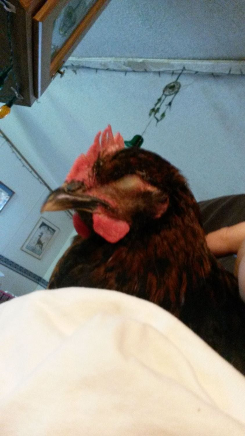 This is Spencer a few weeks ago, his eye got pecked by my older chicken that got in his pen.