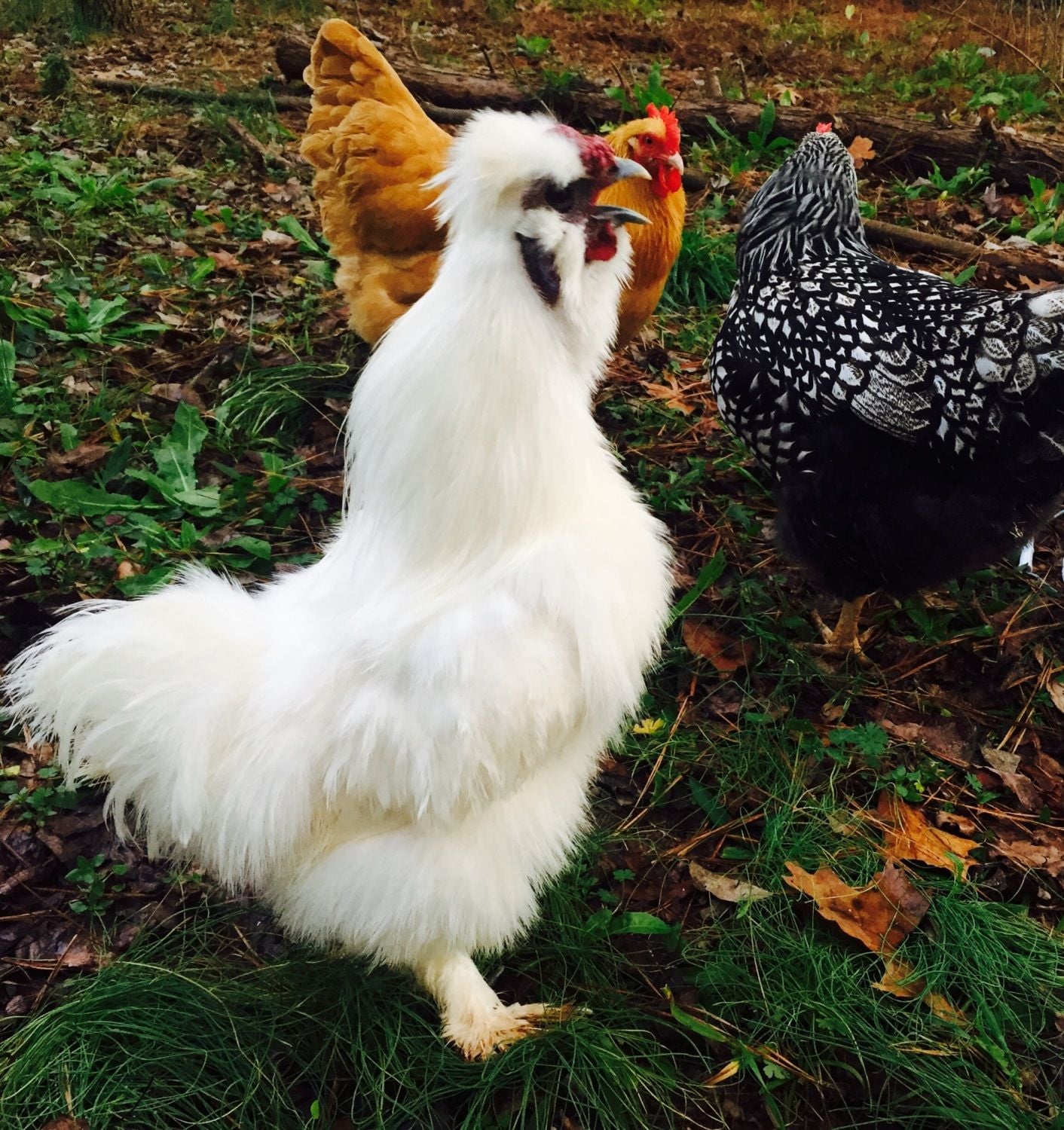 i have a white Japanese bantam myself.  he's got this lovely gold tint to his feathers, and golden wing patches.  right no he is very fat.  i don't know how he got that way because his aen't fat but they aren't wanting for any food either.  his hens are two lovely sebrights.  he's also got three daughters who will join him in the Spring.