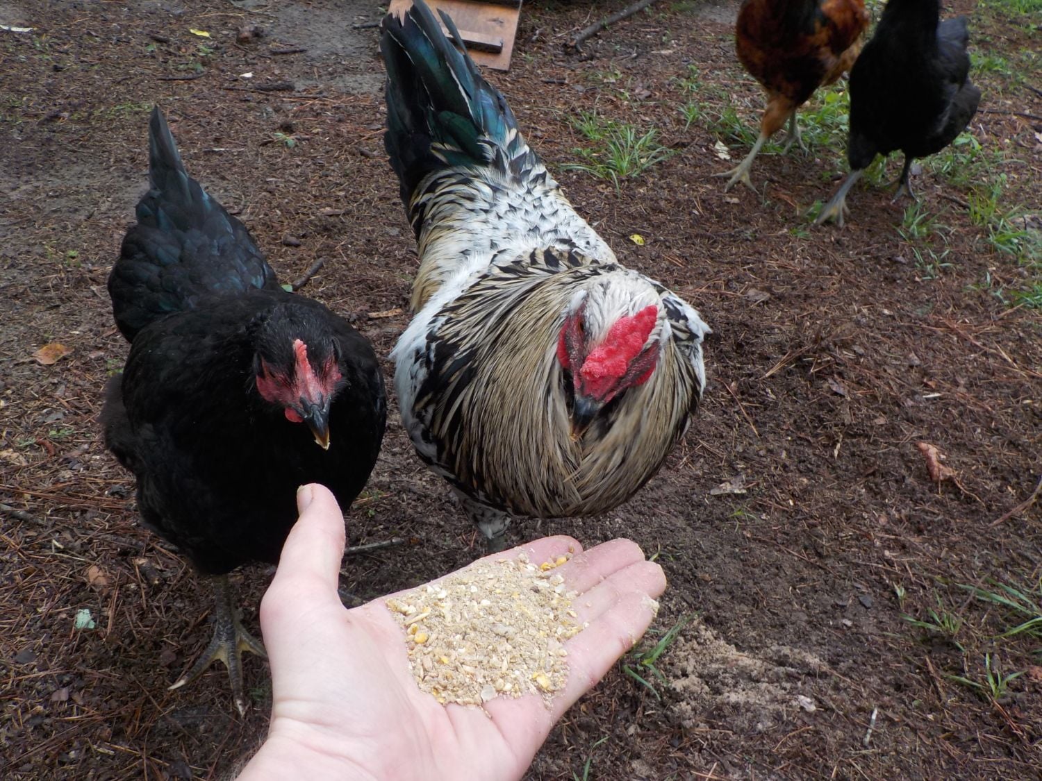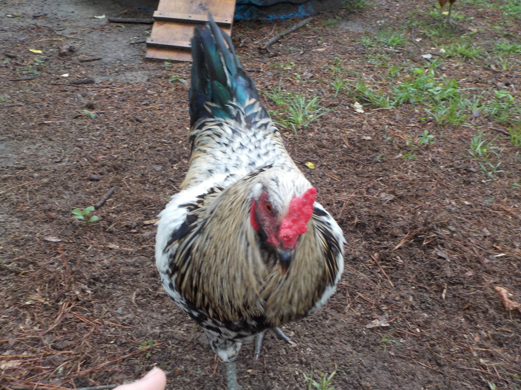 Interesting.I hand fed his flock as chicks over 2 yrs ago and he never would do it then. As he has grown he and I have learned much. Regular feed nope, but give him dandelion greens and he is a happy guy but don't hold em in your palm. He is not gentle over getting his greens.He will run over his hens to get to them.Big bulldozer.