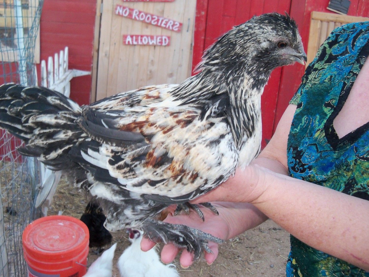 Haha! I love that in the background, it says No Roosters Allowed!