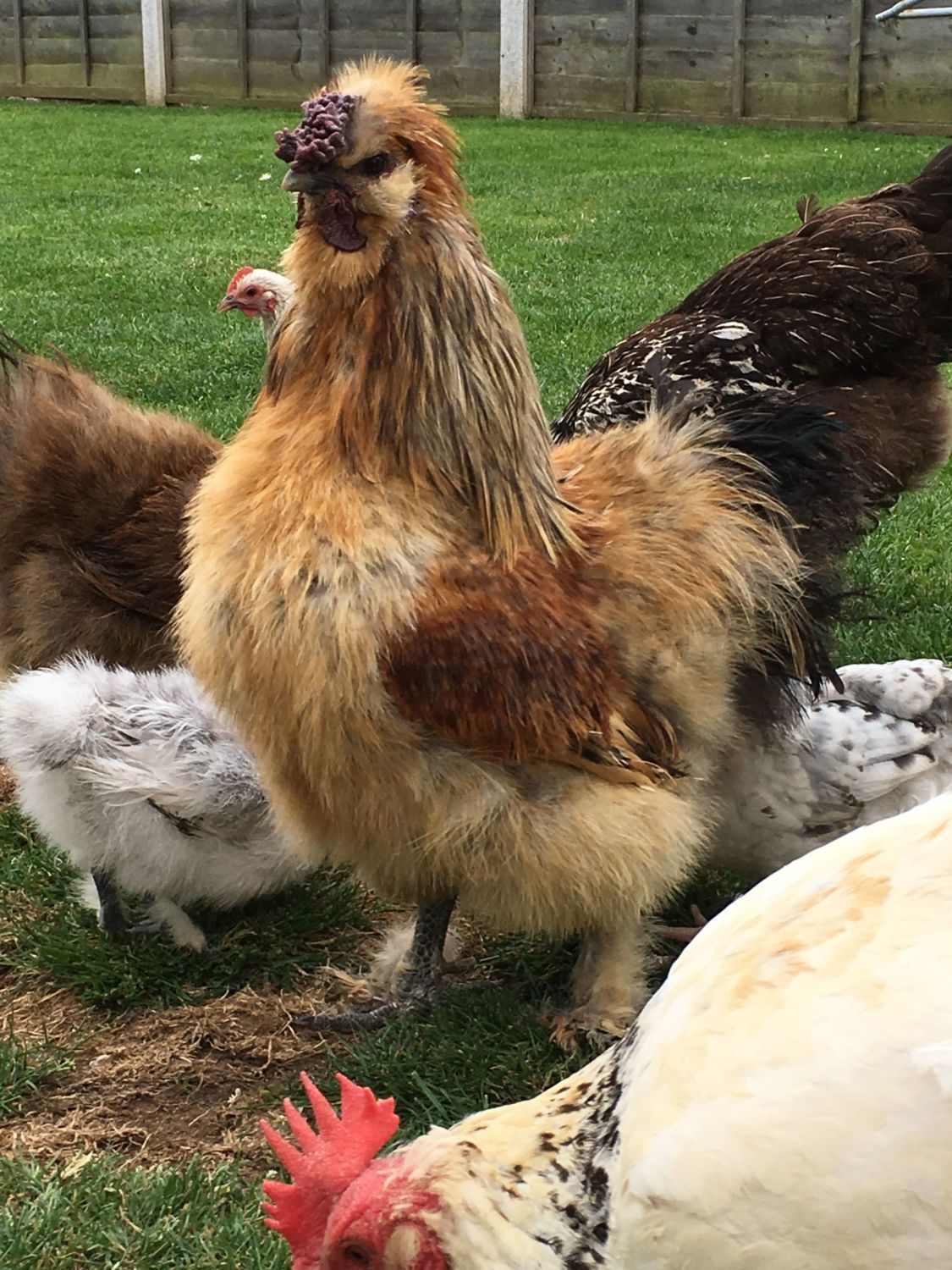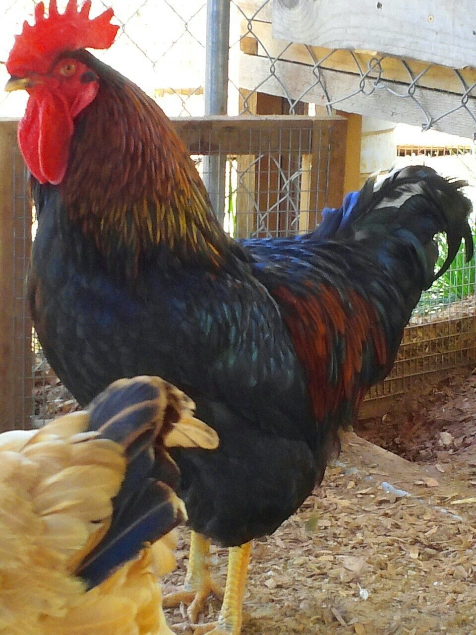 Wow! Look at the waddles! Handsome feller you have there!Here is our Chanticleer. He's about 15 months old now and stands somewhere between a foot and a half and two feet tall (I've been meaning to put a yard stick up in the coop and catch him standing next to it so I can be more accurate - but it's closer to 2 feet). His body size is roughly between football and basketball. He does a great job of keeping things in order around his coop! - oh, quick edit... those are white feathers in his tail, not just a background lighting effect. They just started showing up over the past couple of months, and have grown a bit longer since this pic was taken.
