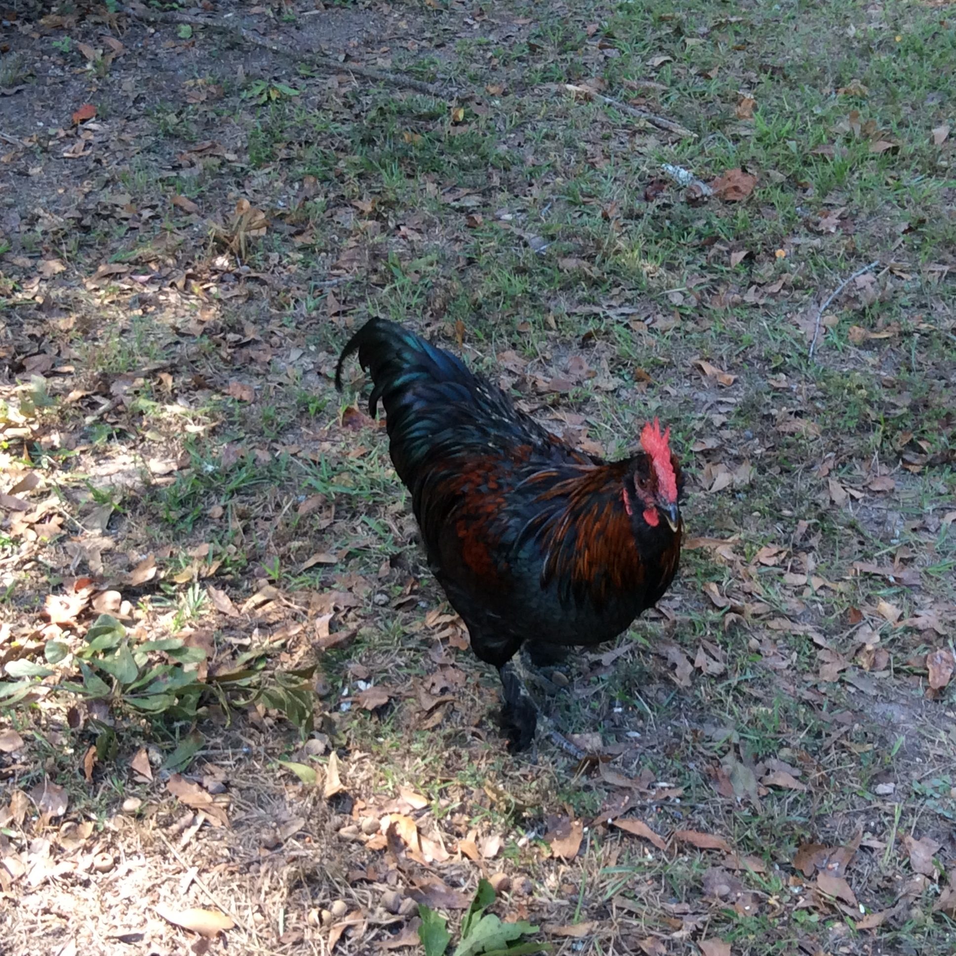 This is Beauregard. He was formerly known as Lucille until he started crowing on Saturday. All 3 of them are 22 weeks old tomorrow. They are a cross between a giant Black Cochin and a little bantam mix hen we have.