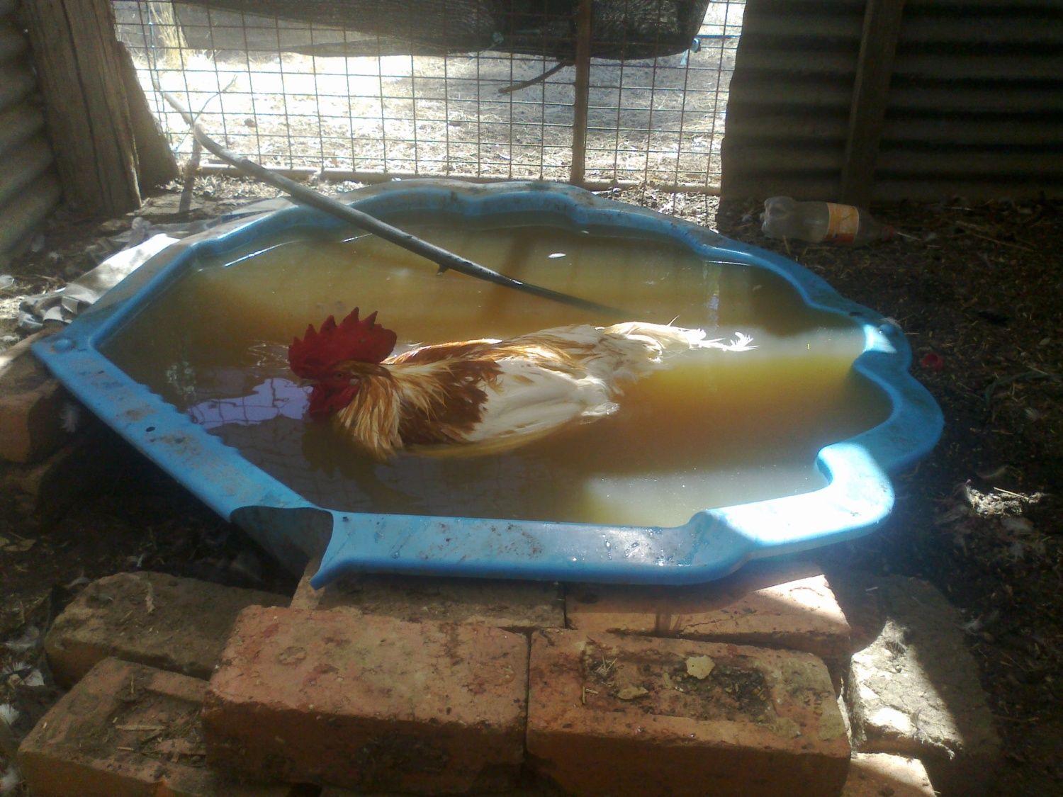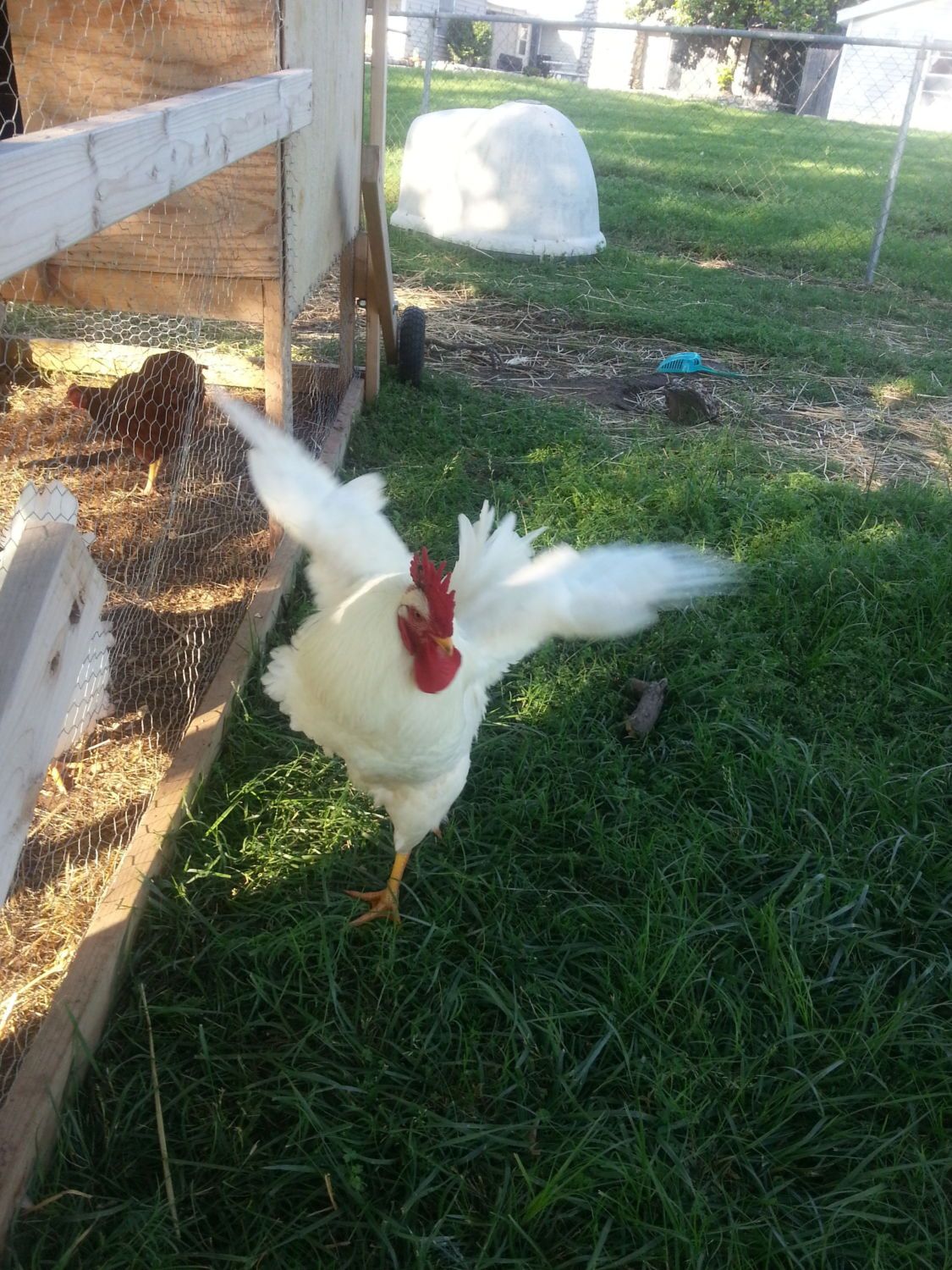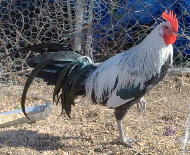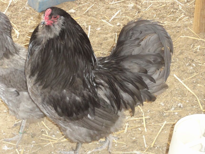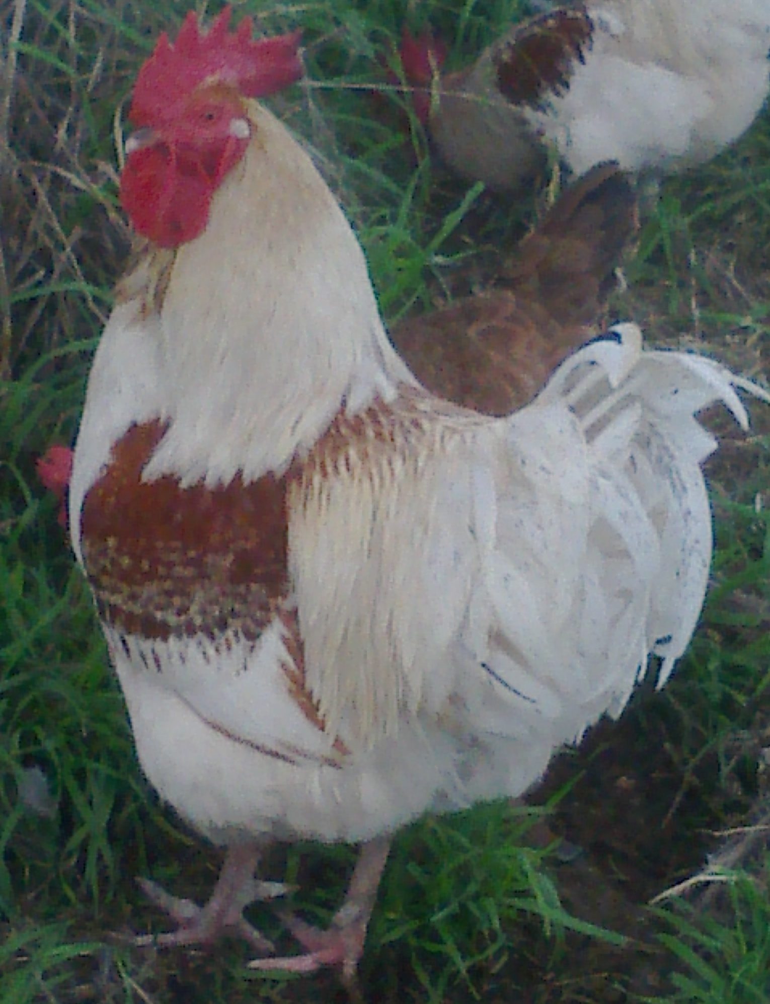 Was supposed to get down to Estes Hatchery and pick up some more Black Sex Link chicks (target was late March) however, owing to time constraints, all we got was a cockerel, this year, from an acquaintance. All I know for sure is that he has some Game in him. Didn't really want him because BSL's are nearly invisible to preds, in our woods; this guy is like a beacon. He settled right in with our remaining 8.5yr. old BSL hen (cockerel 4 months). He sometimes eyes the turkeys with bad intent but has otherwise been a perfect gentleman.