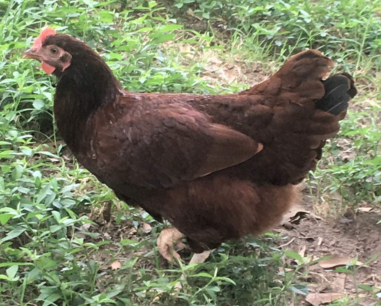 Color isn't the only thing that defines a good quality RIR. Just because a bird is simply dark doesn't make is "show quality". The standard does call for rich, deep mahogany color but there is a lot more to it. Your bird is not particularly light in color, however I see a number of things wrong with your bird. First of all, her type is off. She should be more deep bodied and have a much more pronounced breast. RIR should have a "brick shape" to them, as they were originally developed to be dual purpose birds. Her comb looks like it has far too many points and they don't follow an even progression of size. Her legs look pale and washed out, almost white, they should be a bit more yellow. Her tail angle is too high, it looks like about 25 degrees when it should be more like 10 degrees. Her tail could also probably be a bit more full, also. Sorry she isn't show quality, she looks more like a production quality red to me. While I am sure she is a great pet and layer, she probably wont do anything for you in a show hall or in a breeding pen.