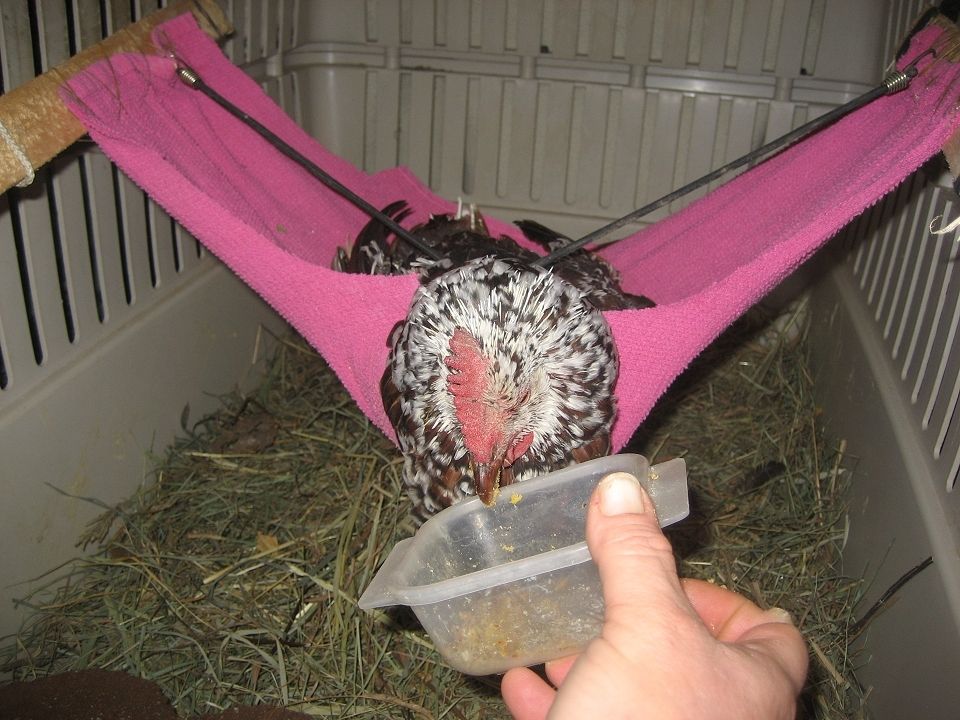 .. she is still recouping in my hospital cage inside my living room, but she is fine, her leg came back and she is gaining weight steadily. How she is even alive I have no idea, but she is the toughest little hen there ever was........ and I'm very grateful to have her back. she is also very sweet as are all my Hatchery SS girls......... I had 4 but 1 had to go she was eating eggs, but I have never seen a more resilient or friendly chicken,................. Kim