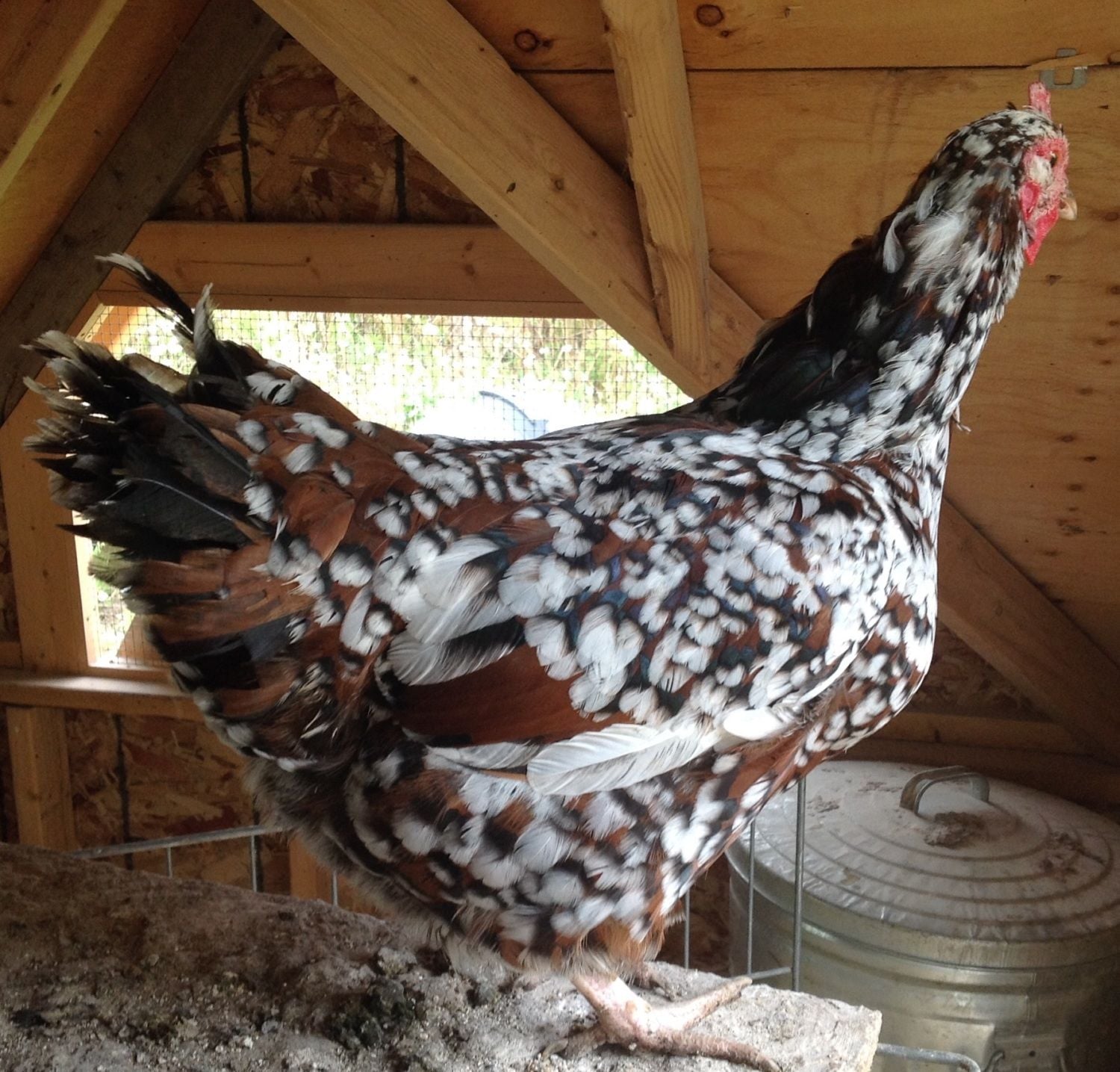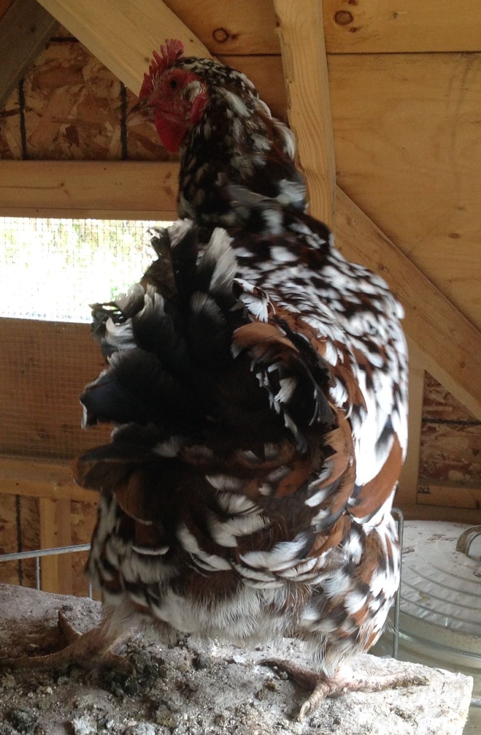The tail looks like they are supposed too. It looks a little open and I like it. She has way too much white though. I like her back a lot. I would use a male with less white and run with it. She looks to also have some pure white wing feathers.I wondered if anyone could comment on this girl? She's moulting and looks terrible. She just spent two months broody and was unsuccessful. That aside-- I saved her mostly for her tail. I had never seen a tail on a speckled Sussex like this before. I know she has many faults but do you think she is worth a try breeding for the tail? Or is it not even a correct tail? It's normally not that messy! It's normally a perfect arch--all feathers in line. I could see if I have any pictures of her when she looked neat.