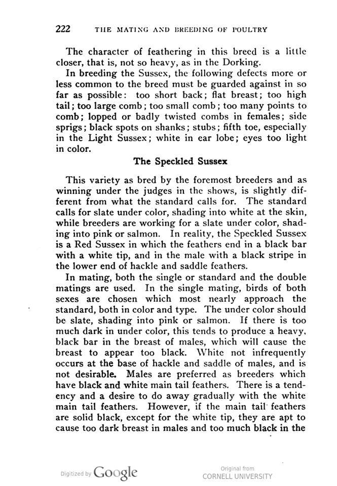 Color of Speckled Sussex.In mating the Speckled Sussex the first thing to consider is type. The Sussex fowl has a type distinctly its own, and it is type that is both practical and very beautiful, and breeders should strive to maintain. In picking the females for the mating select those having long, broad, deep bodies which slope slightly from shoulders to tail, full, prominent breasts. low well spread tails, shanks of medium length, good substance and set well apart, strong necks of medium length and broad, deep skulls. In surface color, the female should be an even shade of rich mahogany" POMO (?) color over entire breast, back and body each feather ending in a black bar with a white tip. There is a tendency toward peppering in the ground color of the feathers and this must be guarded against, although a small amount of this is not such a serious breeding defect as some people seem to think. Under color should be slate or slate shading into salmon at the skin.