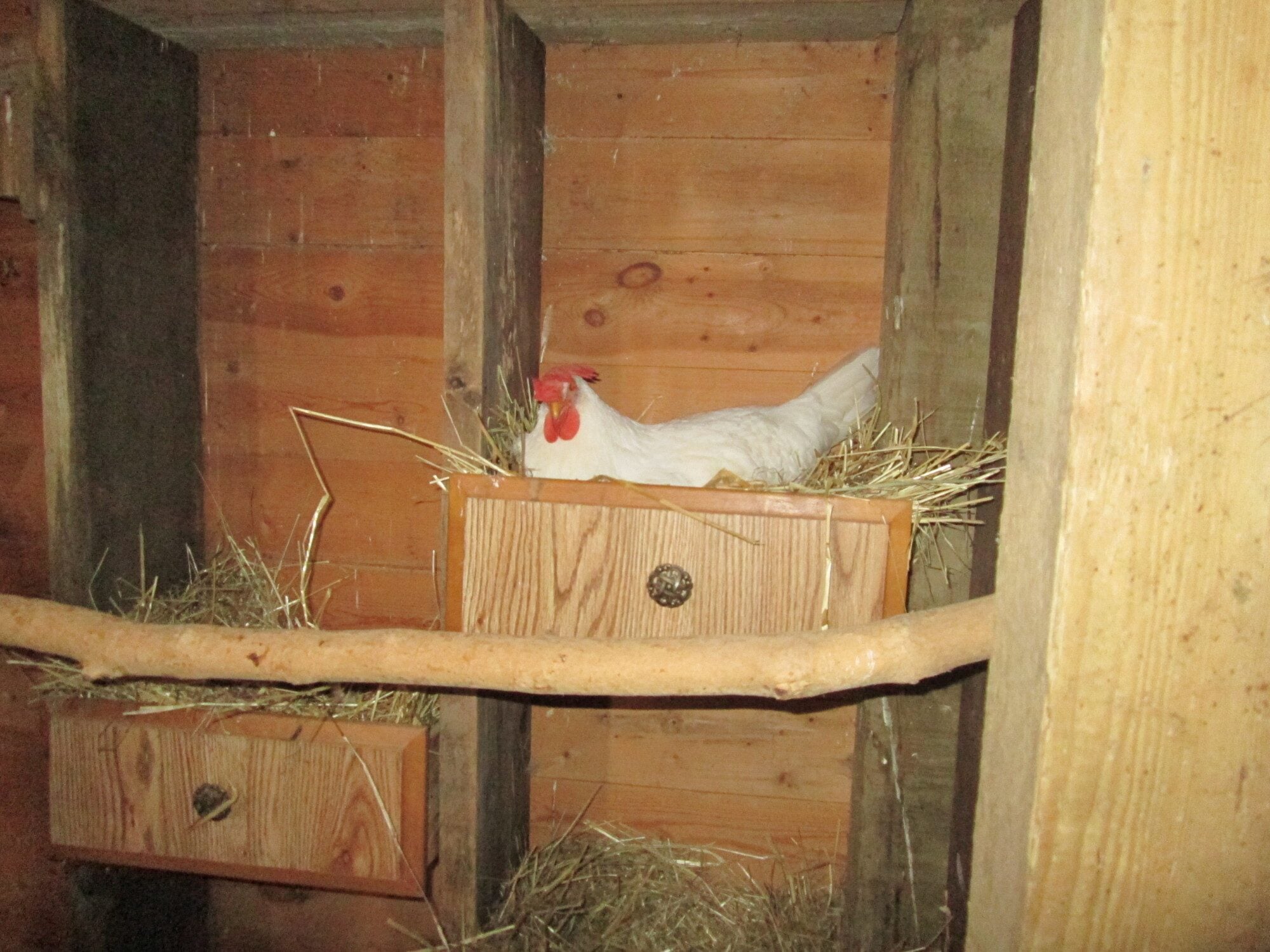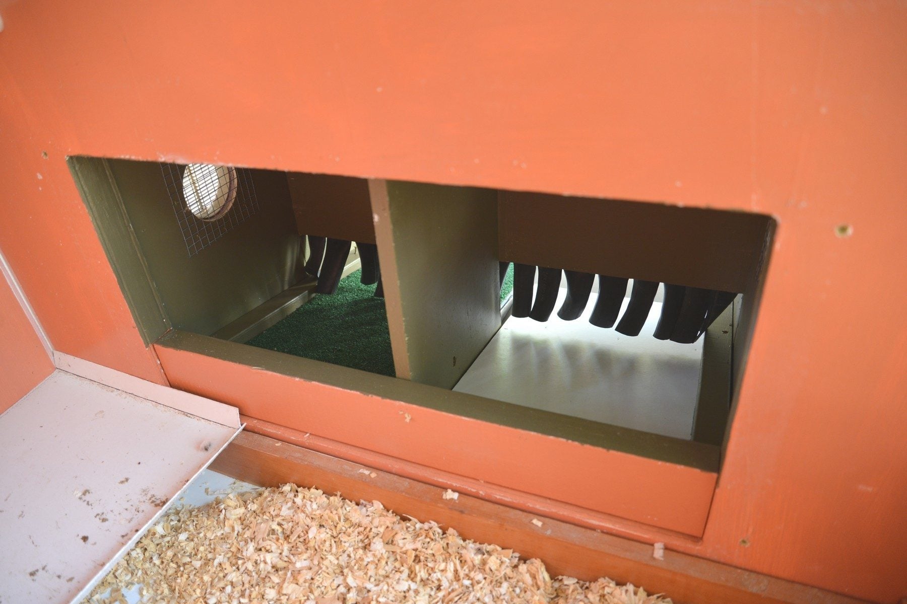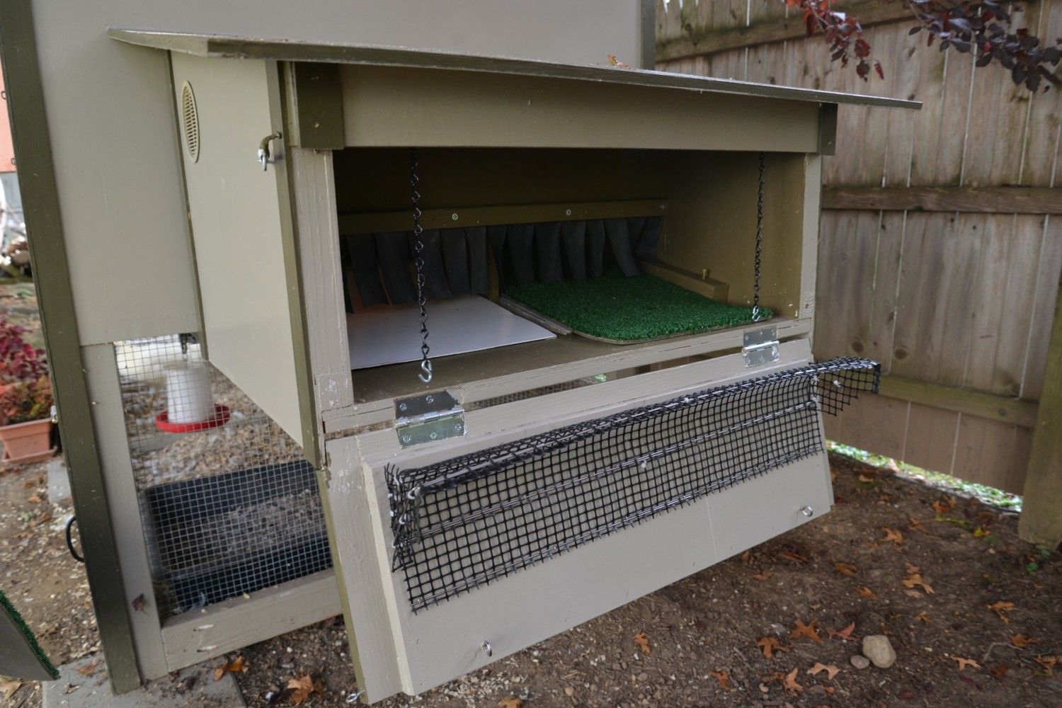 The inside of the nest box is painted a darker "privacy" color, when the nest box door is closed, the box is darken. Here the chickens are first introduced to the nest box at 14 weeks old.