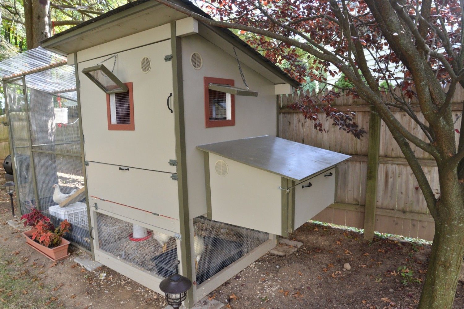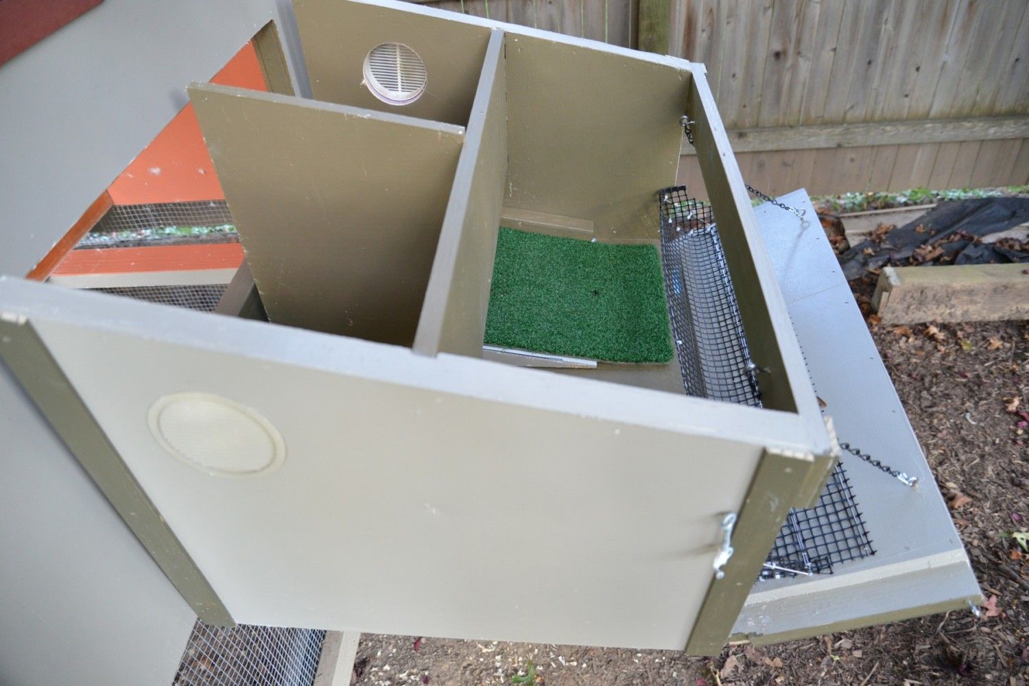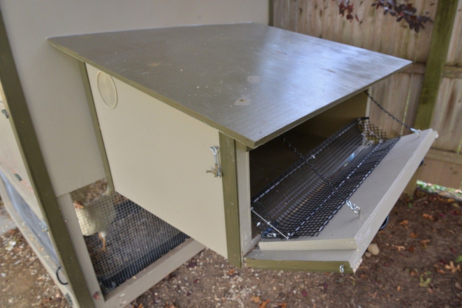The inside of the nest box is painted a darker "privacy" color, when the nest box door is closed, the box is darken. Here the chickens are first introduced to the nest box at 14 weeks old.